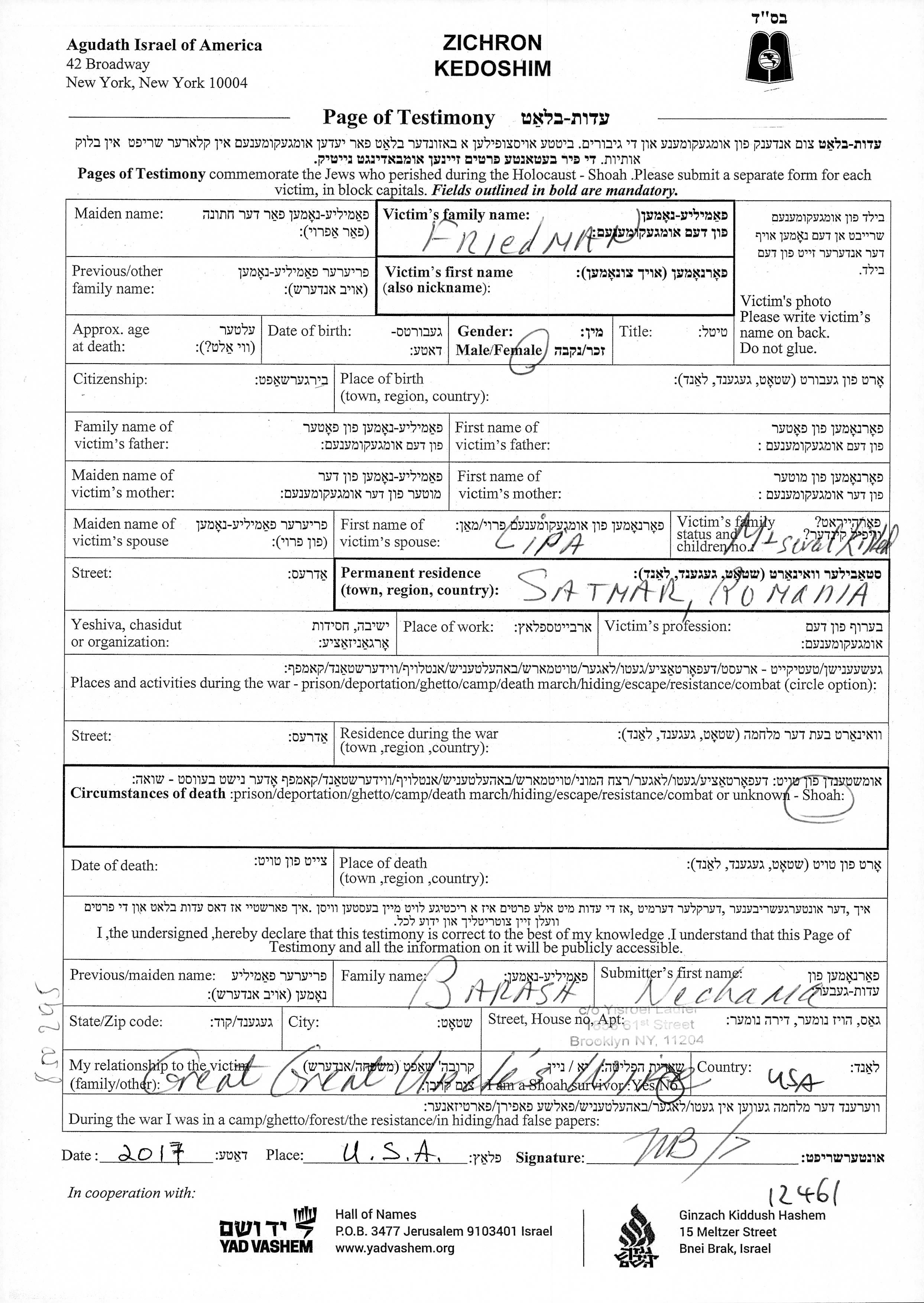 Vorname unbekannt Friedman. Sie war mit Lipa Verheiratet. Vor dem Zweiten Weltkrieg lebte sie in Szatmar, Rumänien.
