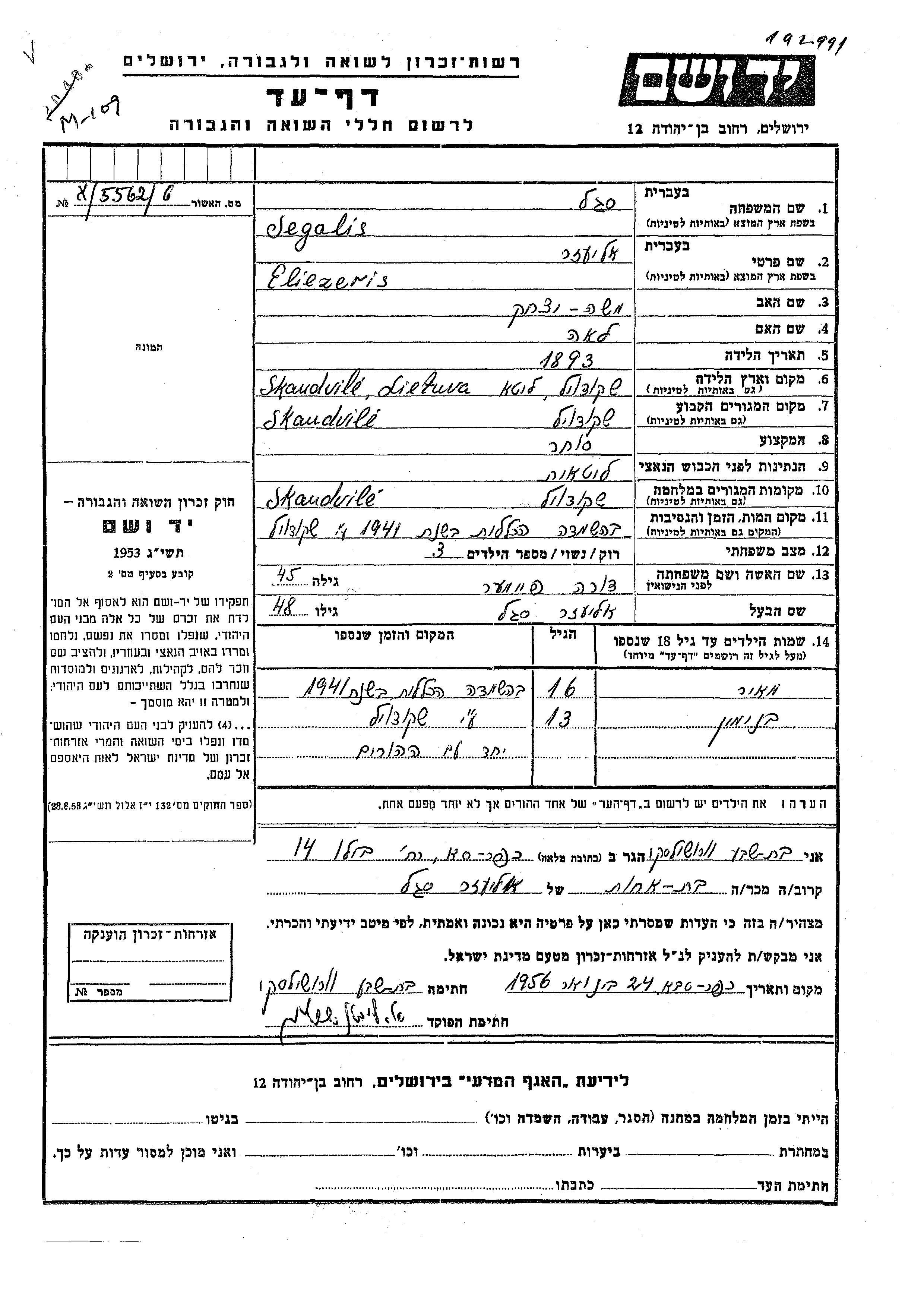 Meir Segalis wurde in unbekannter Ort geboren. Vor dem Zweiten Weltkrieg lebte er in Skaudvile, Litauen.