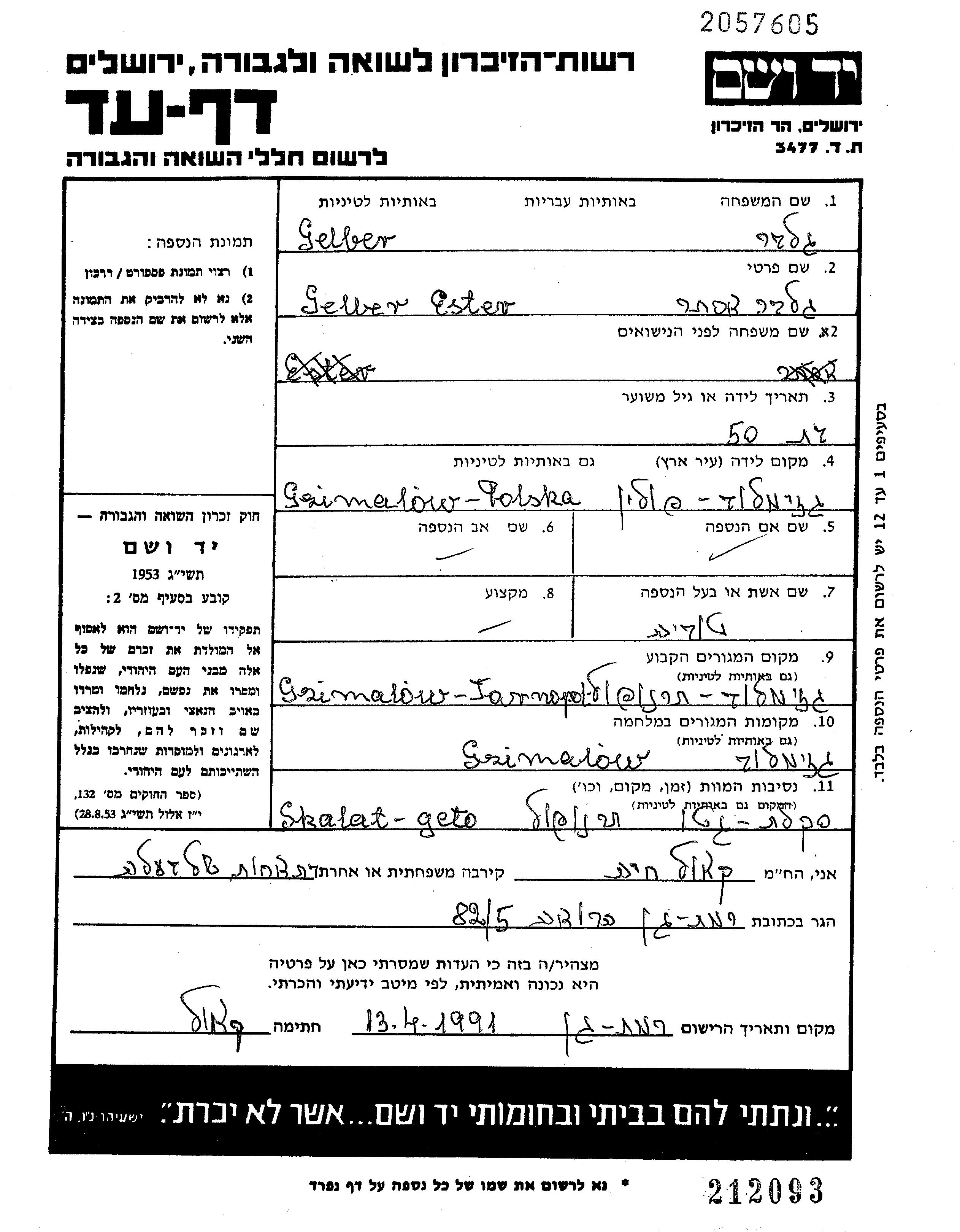 Ester Gelber wurde in Grzymalow, Polen geboren. Sie war mit Tuwia Verheiratet. Vor dem Zweiten Weltkrieg lebte sie in Grzymalow, Polen. Während des Krieges war sie in Grzymalow, Polen.