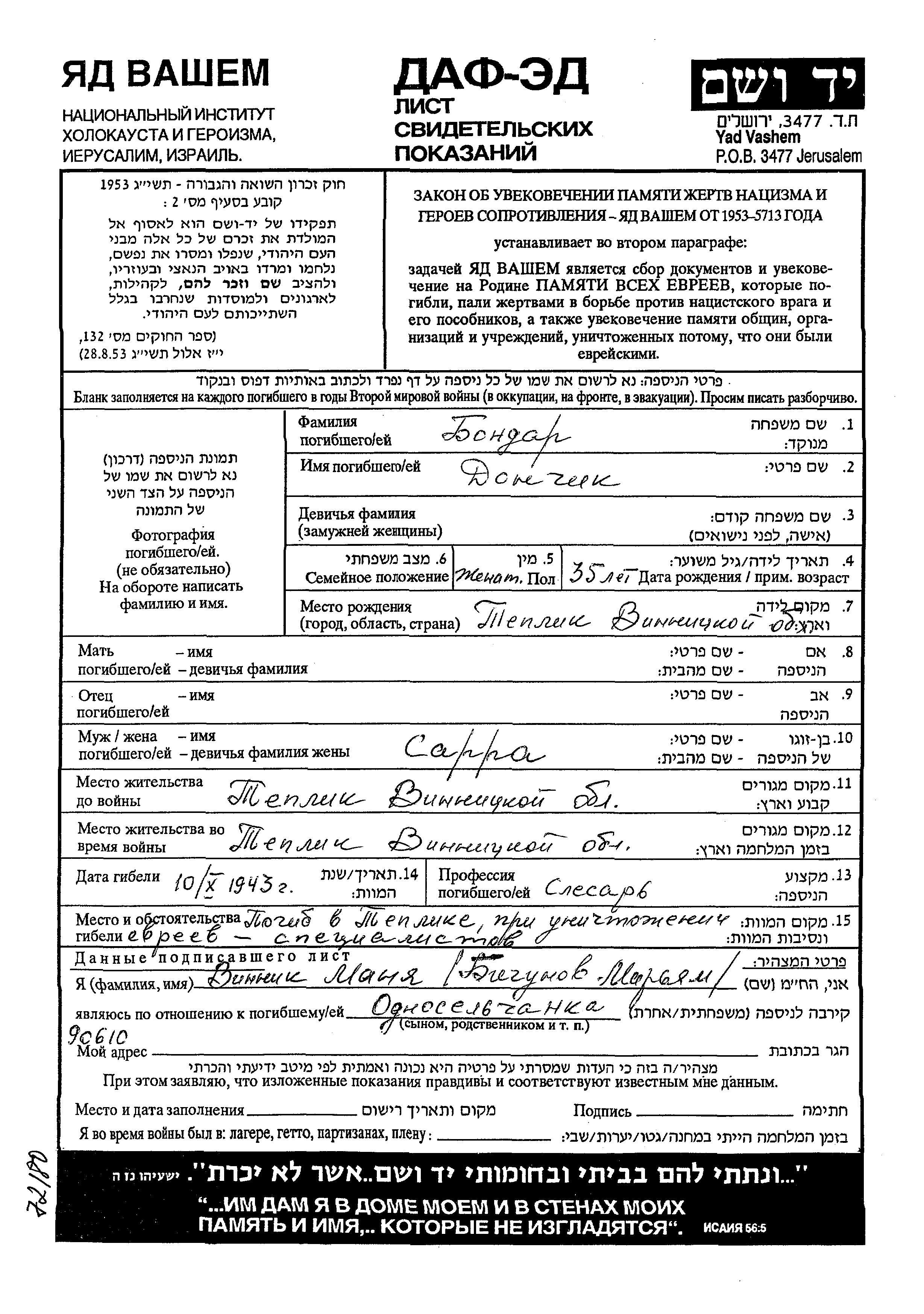 Donchik wurde in der Schoah ermordet. Todesort: Teplik, Ukraine (UdSSR) im Jahr 1943.