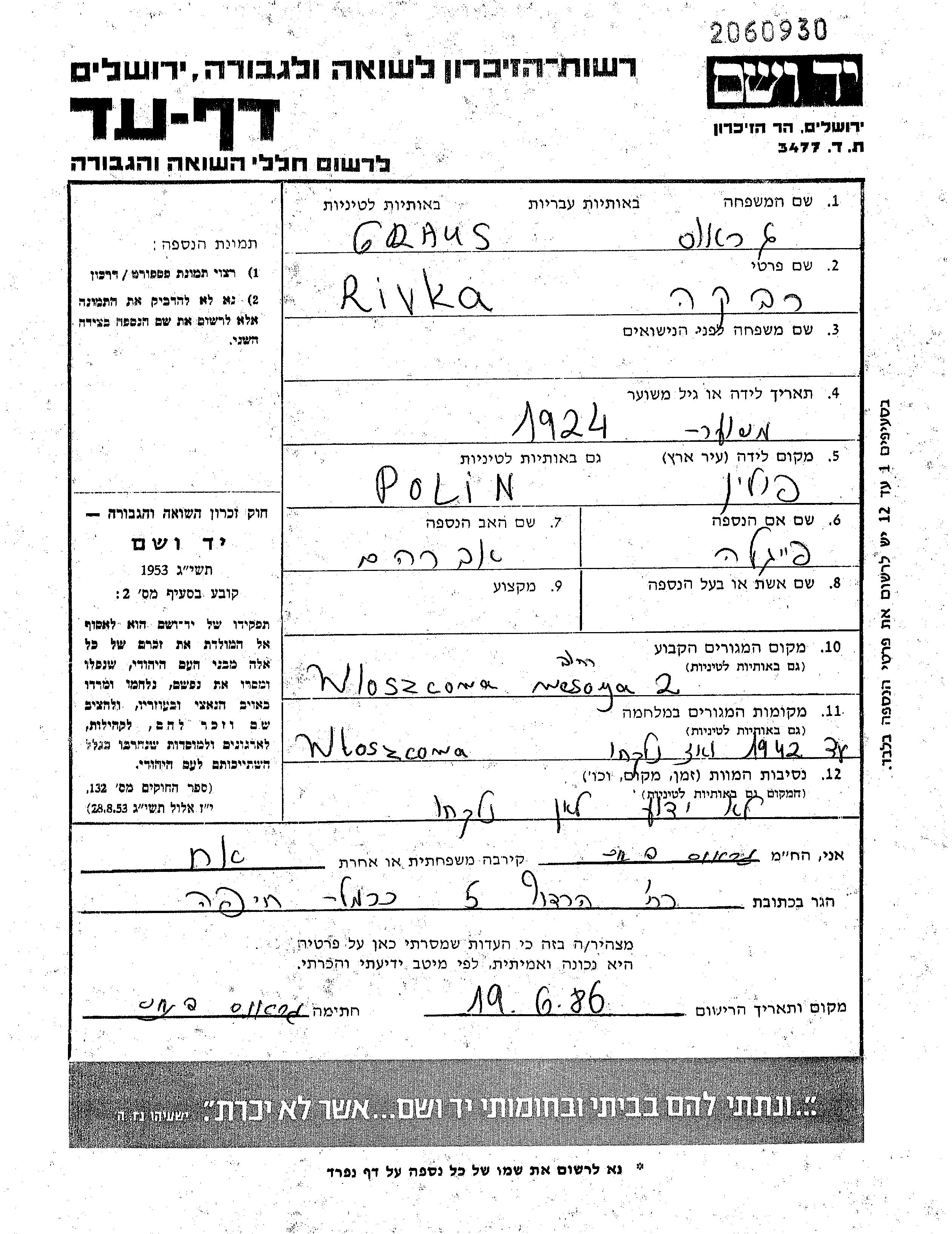 Rivka Graus wurde im Jahr 1924 in Polen geboren. Sie war die Tochter von Avraham und Fygela. Vor dem Zweiten Weltkrieg lebte sie in Wloszczowa, Polen. Während des Krieges war sie in Wloszczowa, Polen.