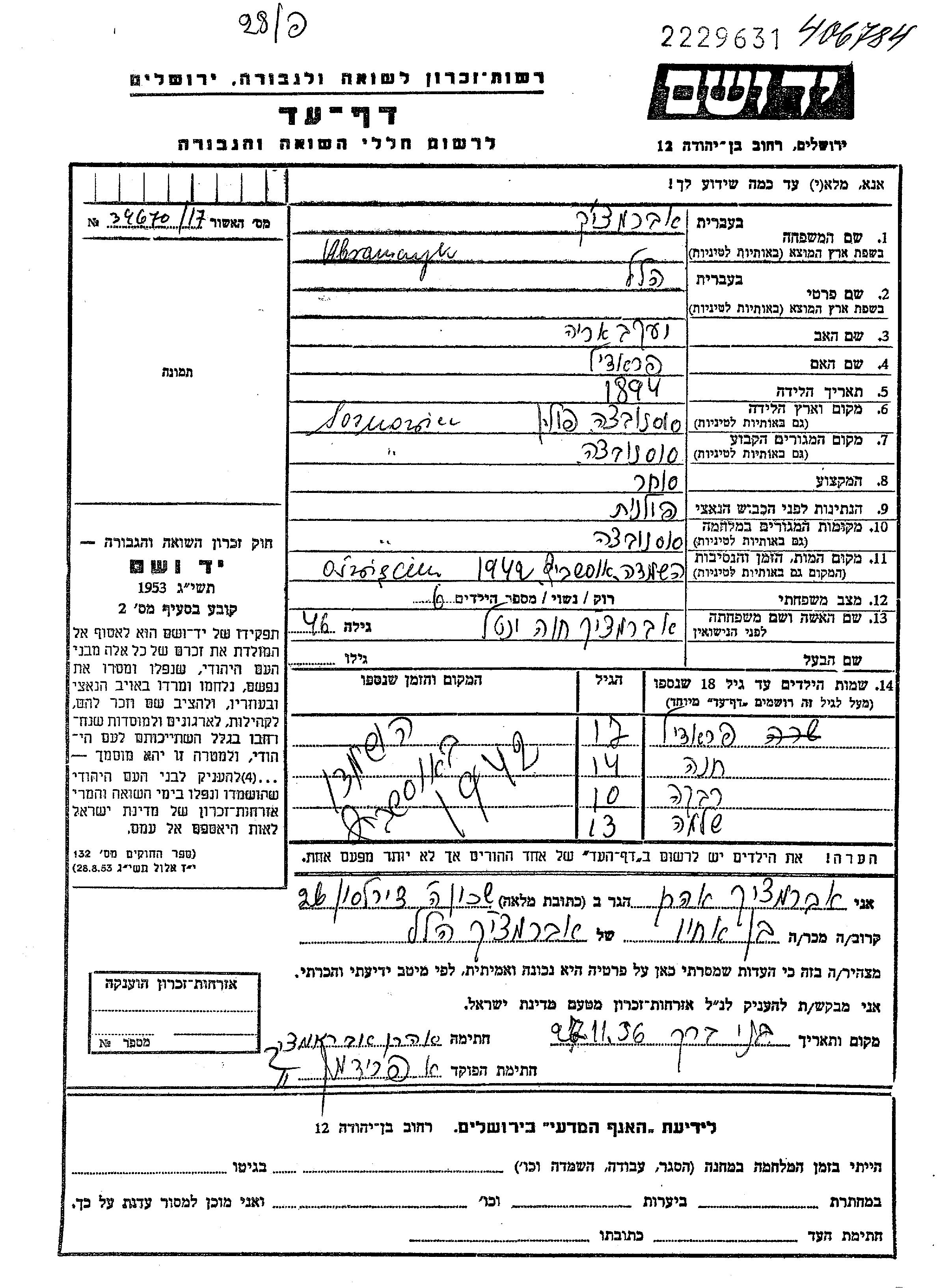 Abramczyk | Hilel | unbekannter Ort, | Gedenkblatt |