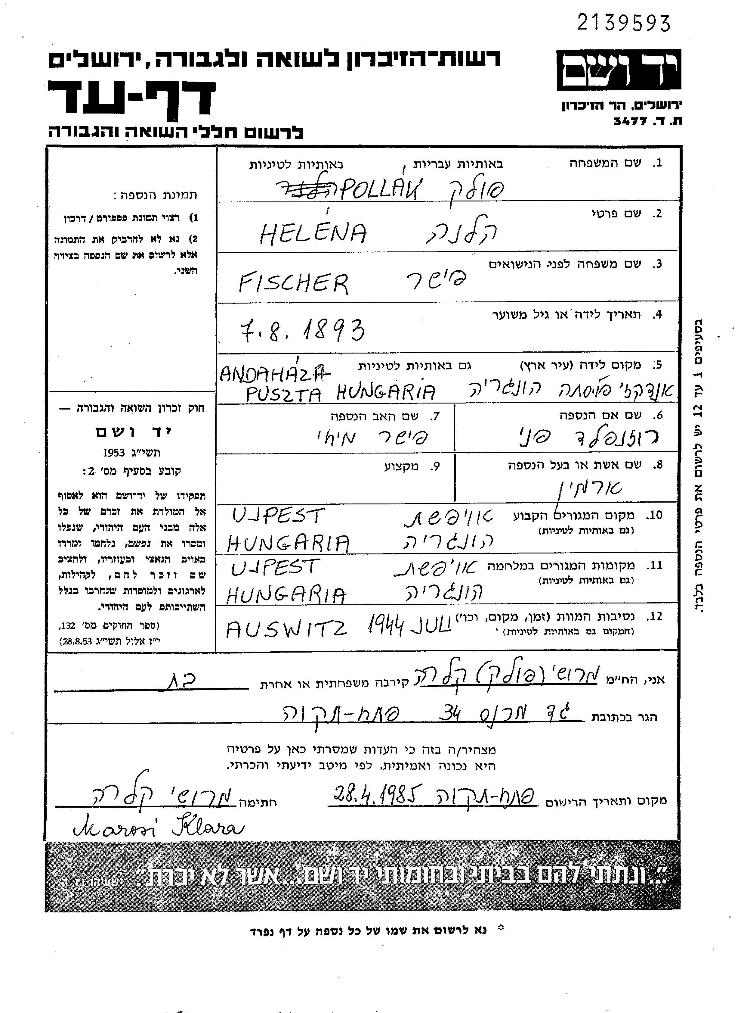 Helena Pollak, geb. Fischer wurde im Jahr 1893 in Andahaza, Tschechoslowakei geboren. Sie war die Tochter von Mihaly und Fani, geb. Rosenfeld. Sie war mit Armin Verheiratet. Vor dem Zweiten Weltkrieg lebte sie in Ujpest, Ungarn. Während des Krieges war sie in Ujpest, Ungarn.