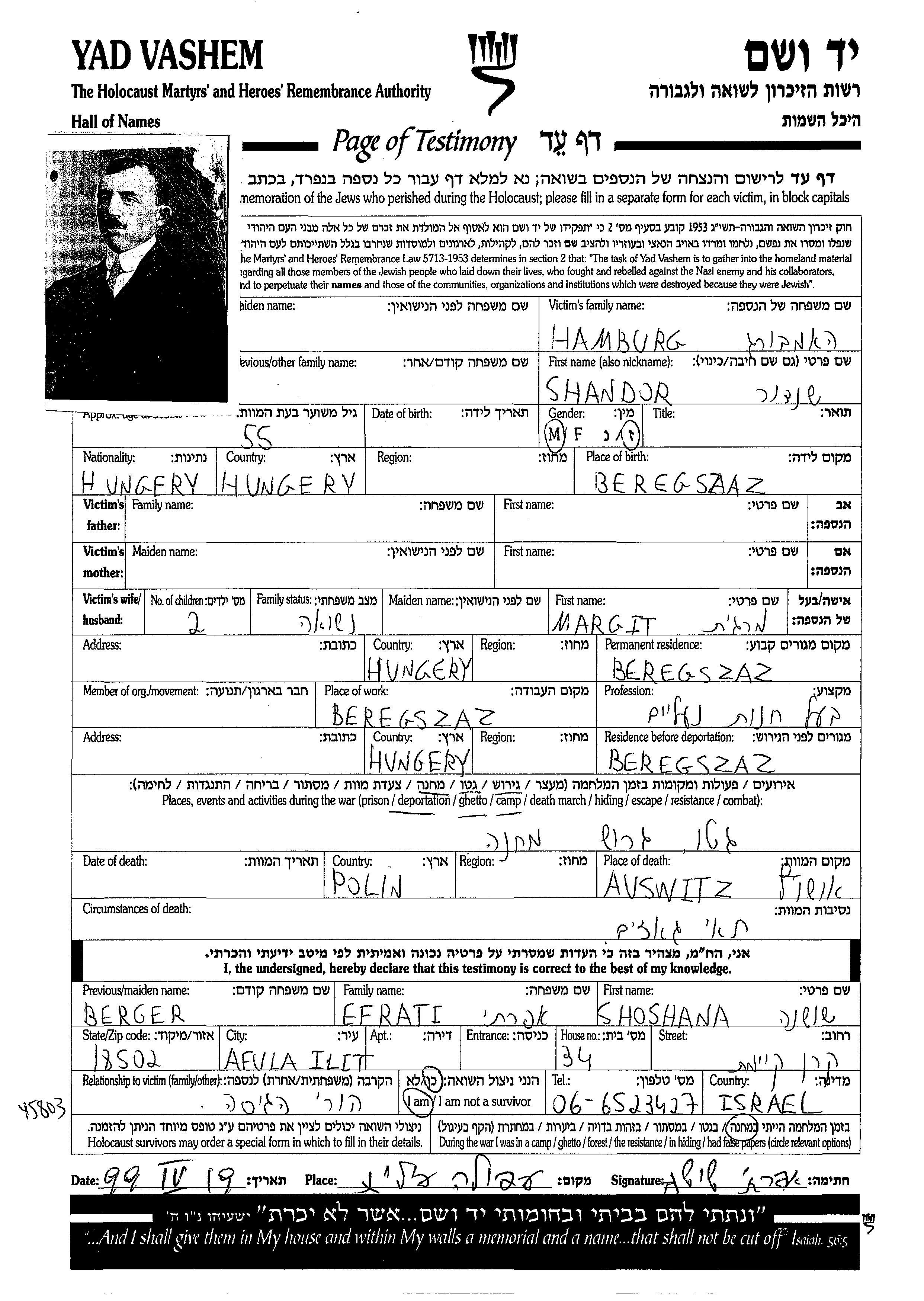 Sandor wurde in der Schoah ermordet. Todesort: Auschwitz, Polen.