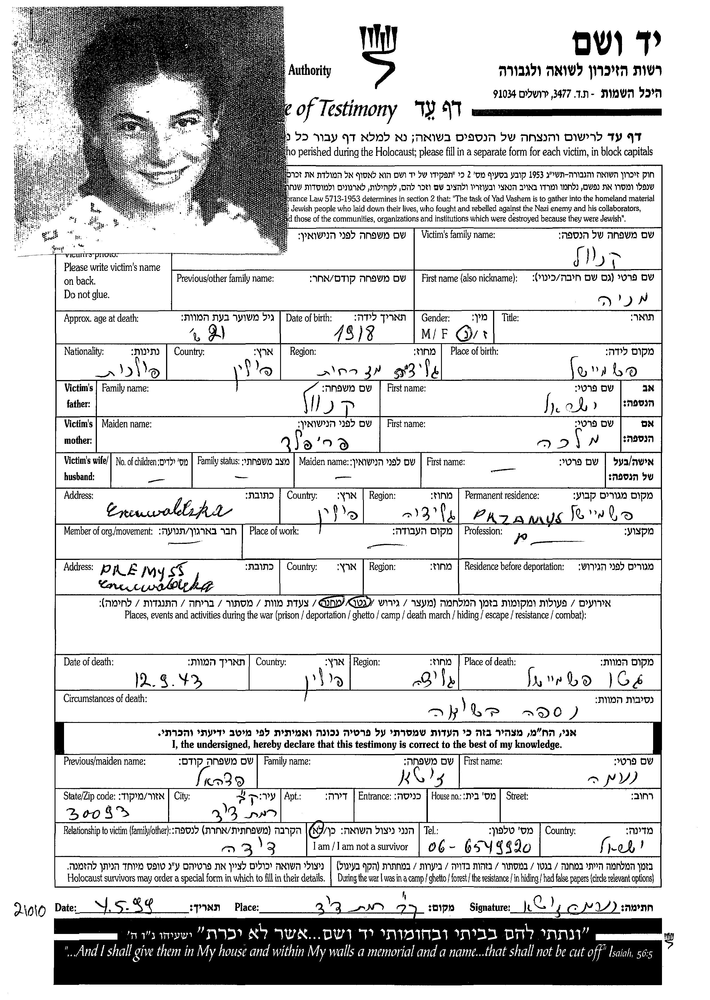 Mania wurde in der Schoah ermordet. Todesort: Przemysl, Polen im Jahr 12/09/1943.