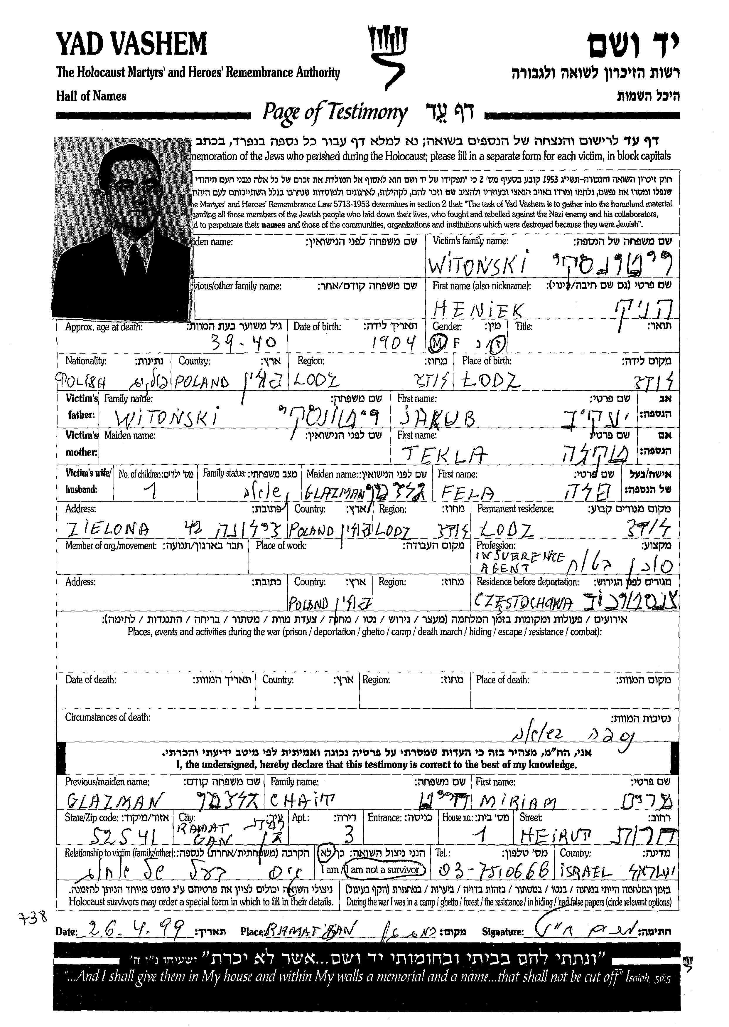 Heniek Witonski wurde im Jahr 1904 in Łódź, Polen geboren. Er war Versicherungsmakler/-in. Vor dem Zweiten Weltkrieg lebte er in Łódź, Polen.