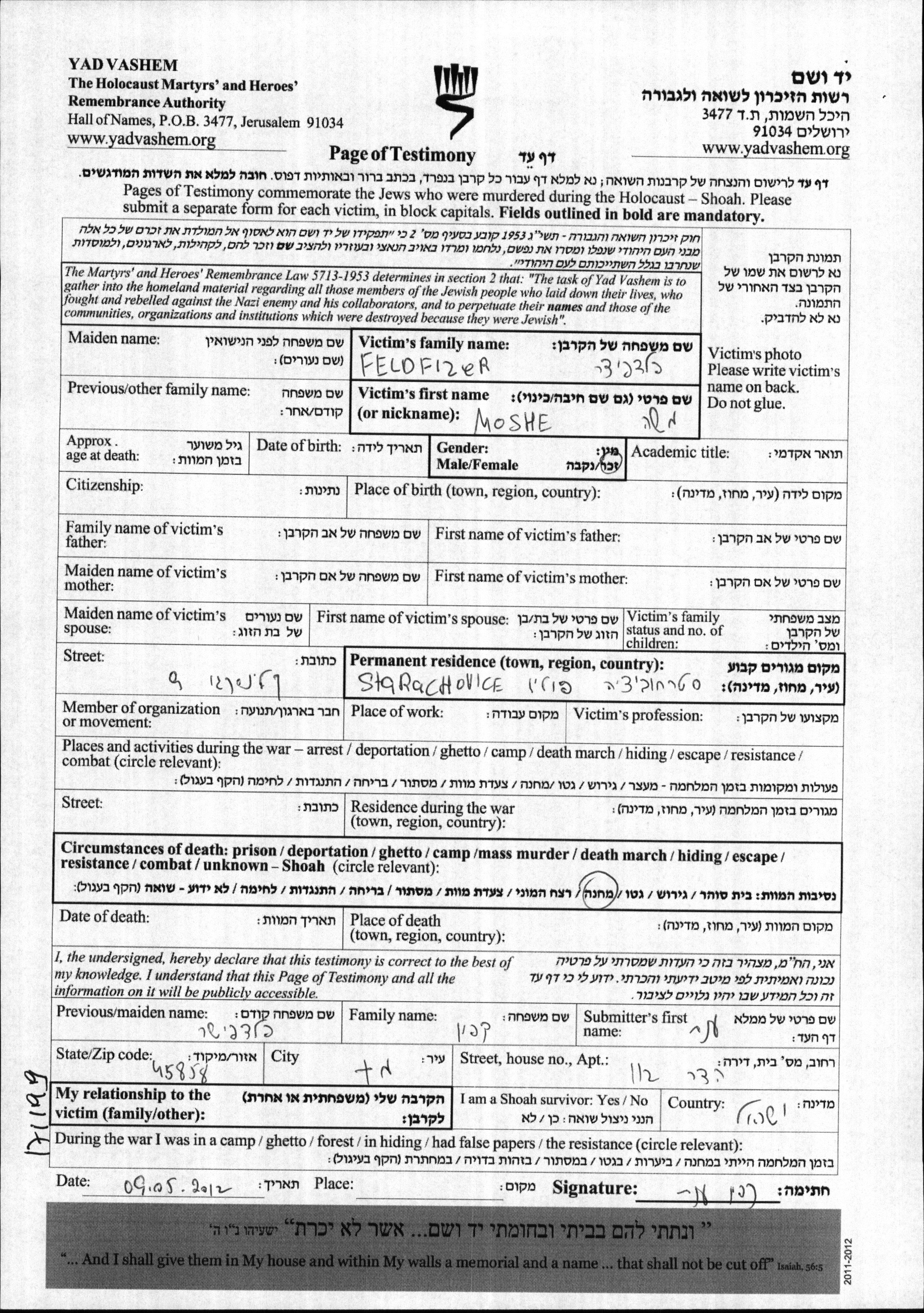 Moshe Feldfizer. Vor dem Zweiten Weltkrieg lebte er in Starachowice, Polen.