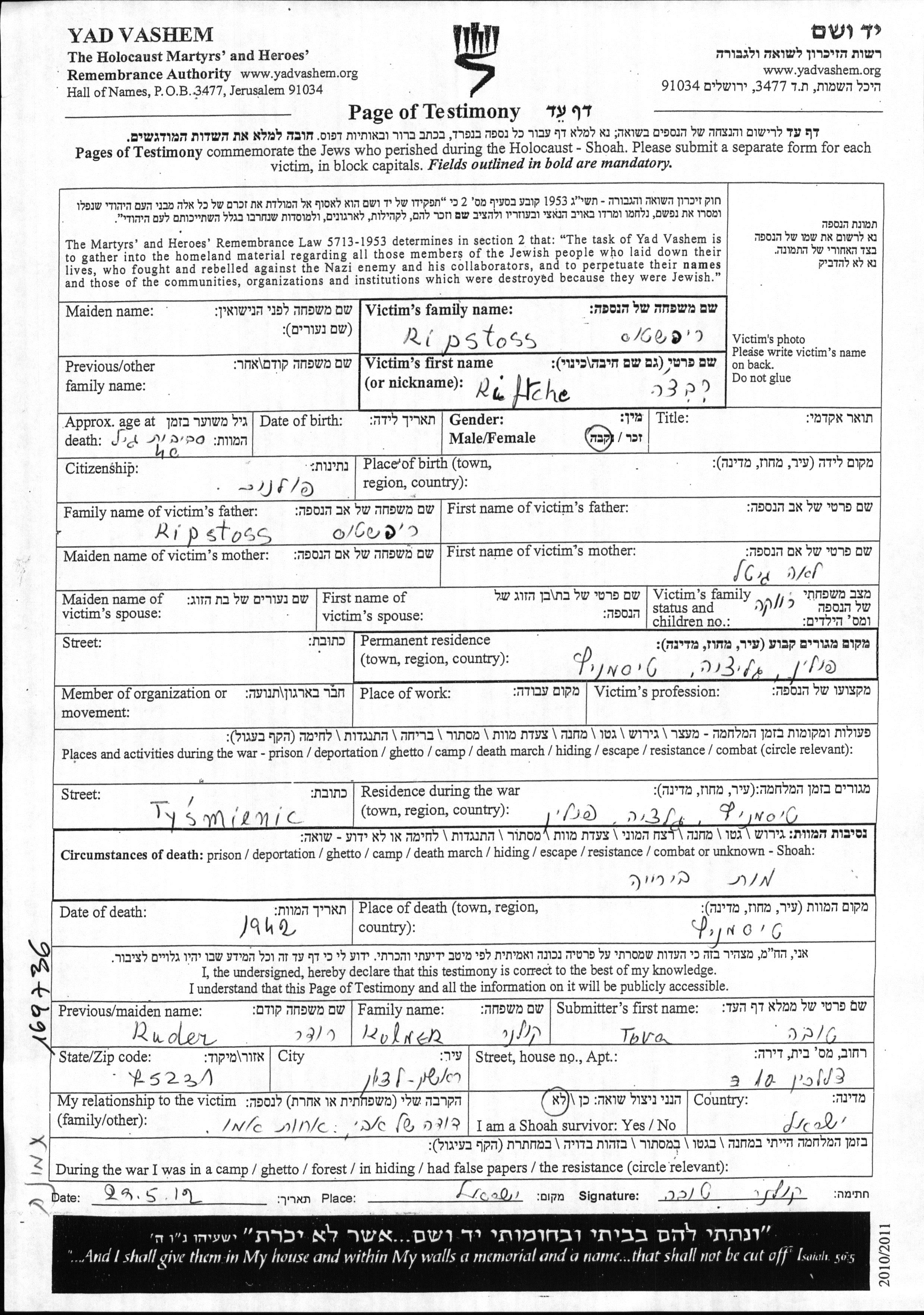 Riftche wurde in der Schoah ermordet. Todesort: Tysmienica, Polen im Jahr 1942.