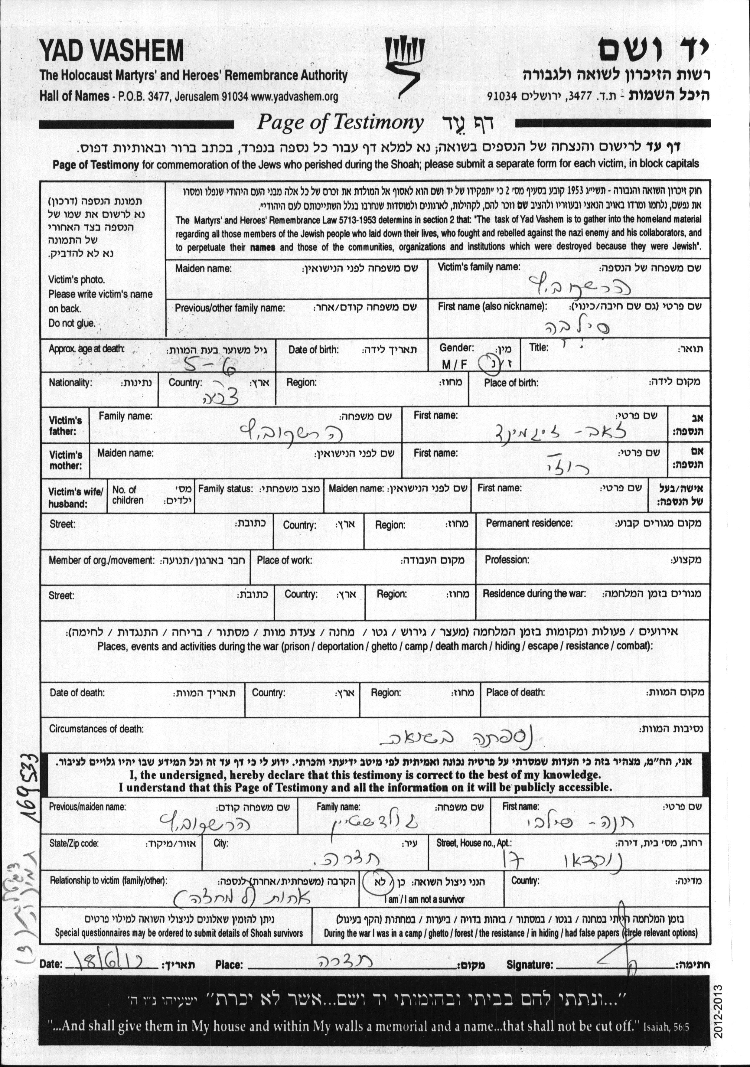 Hershkovitz | Silvia | unbekannter Ort, | Gedenkblatt | |