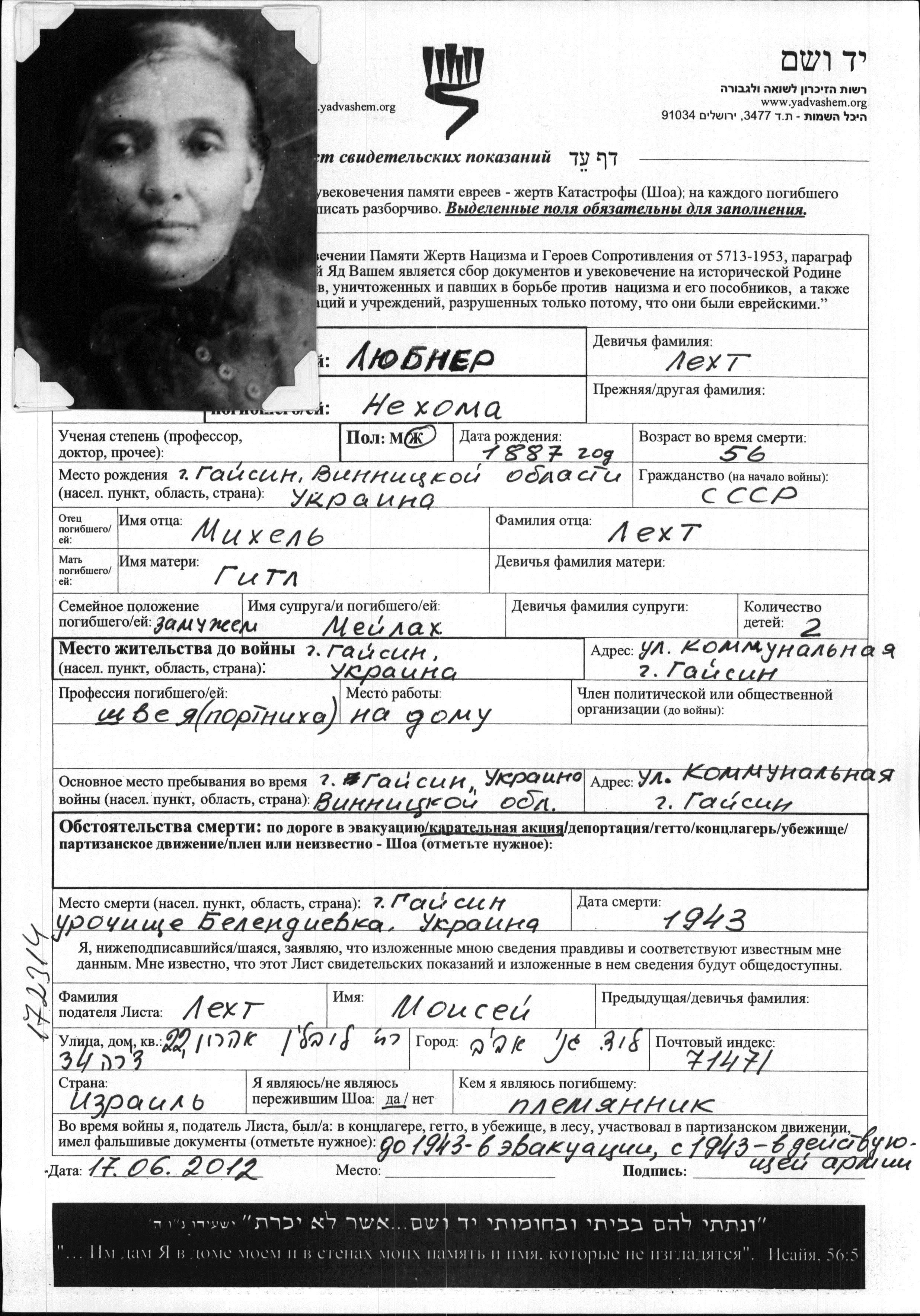 Nekhoma Lyubner, geb. Lekht wurde im Jahr 1887 in Gaysin, Ukraine (UdSSR) geboren. Sie war Schneider. Vor dem Zweiten Weltkrieg lebte sie in Gaysin, Ukraine (UdSSR).