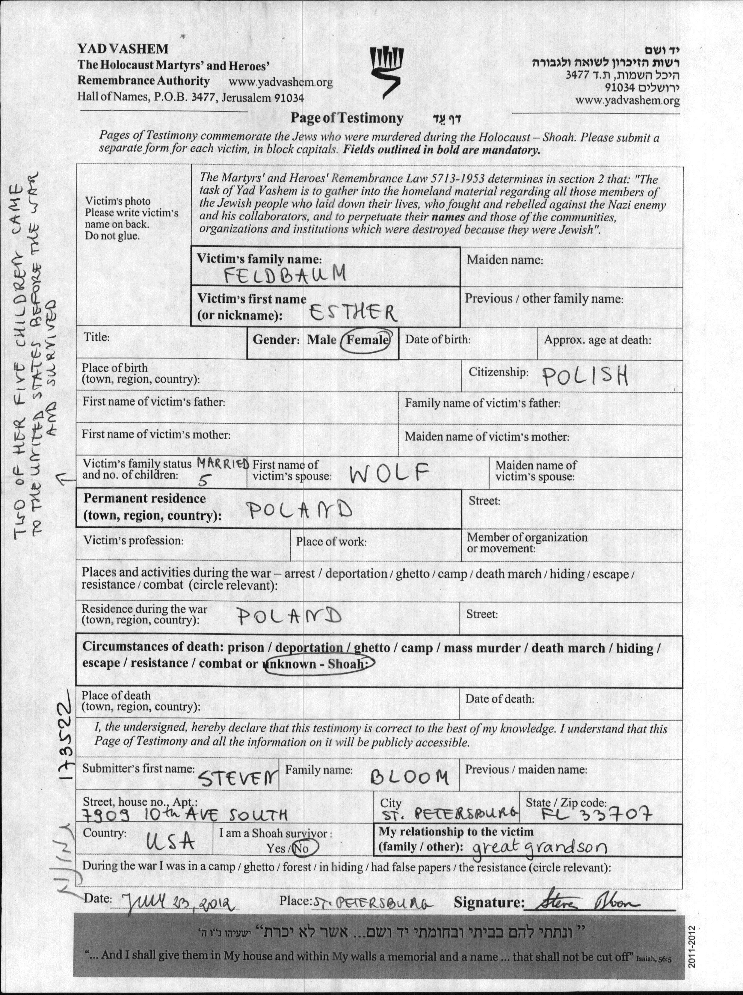 Feldbaum Esther Polen Gedenkblatt