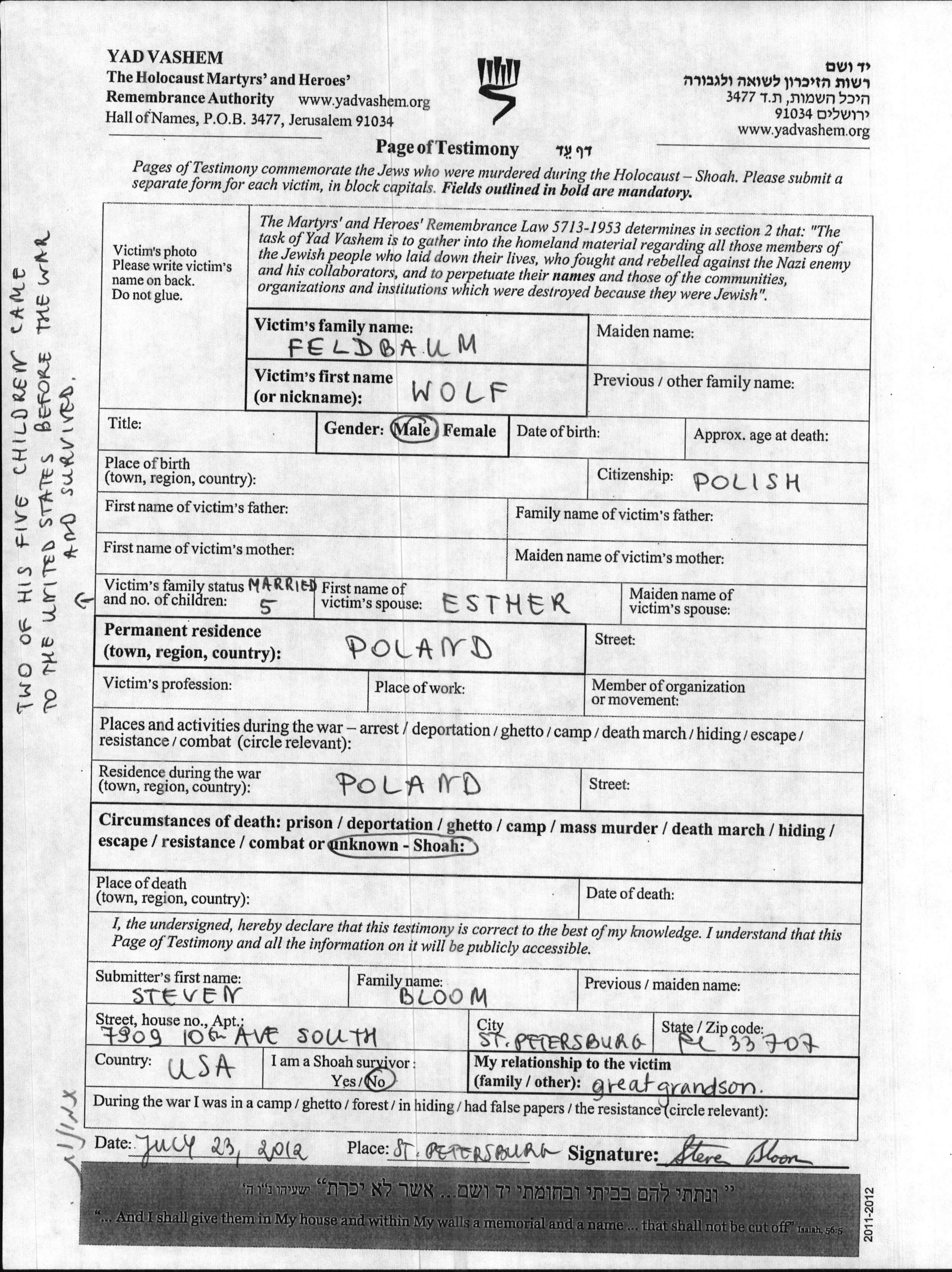 Wolf Feldbaum. Vor dem Zweiten Weltkrieg lebte er in Polen.