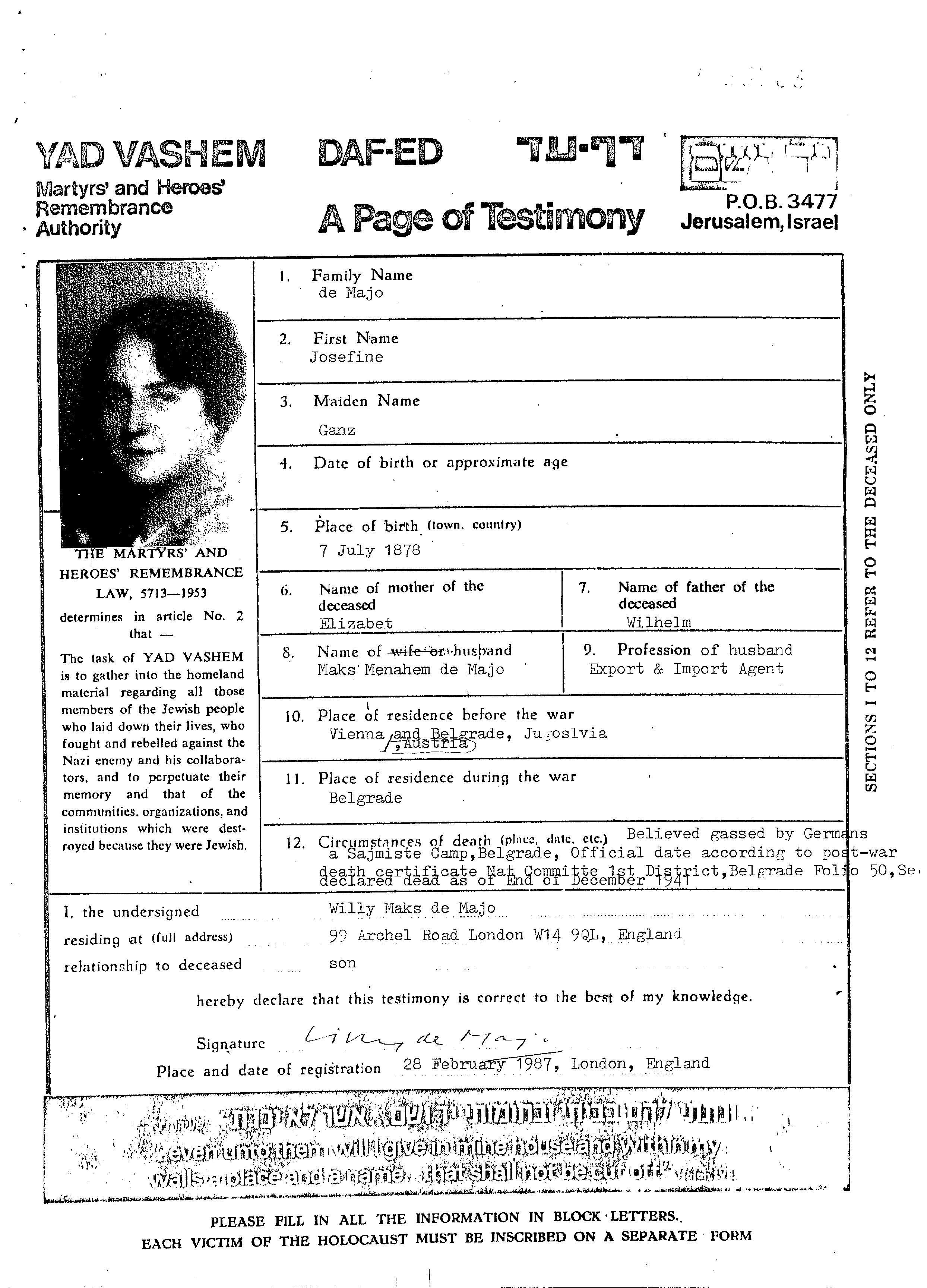 Josefine Majo de, geb. Ganz wurde im Jahr 1878 geboren. Sie war Import export. Vor dem Zweiten Weltkrieg lebte sie in Beograd, Jugoslawien.