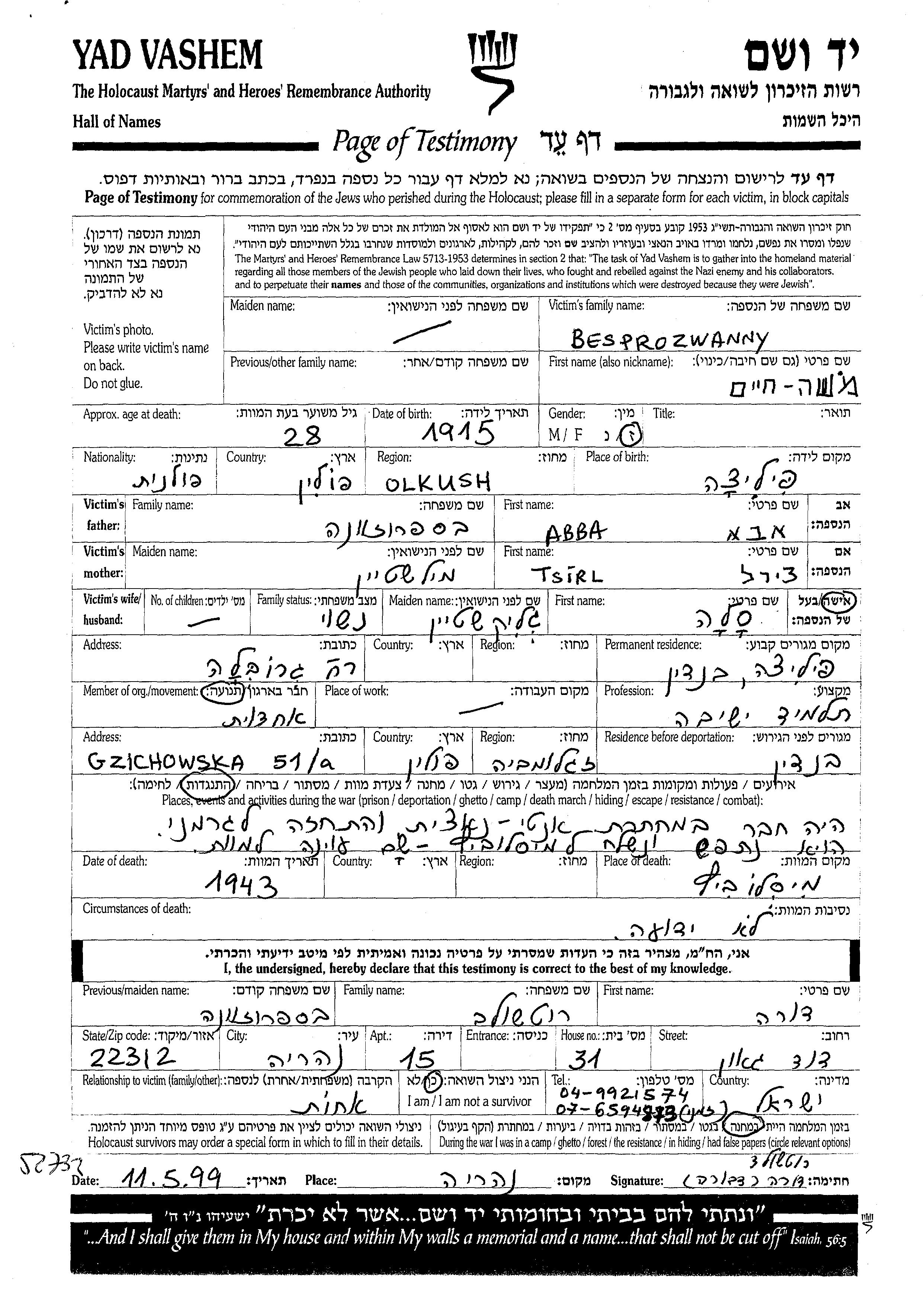 Moshe Khaim Besprozwanny wurde im Jahr 1915 in Pilica, Polen geboren. Er war Jeschiwahschüler. Vor dem Zweiten Weltkrieg lebte er in Pilica, Polen.