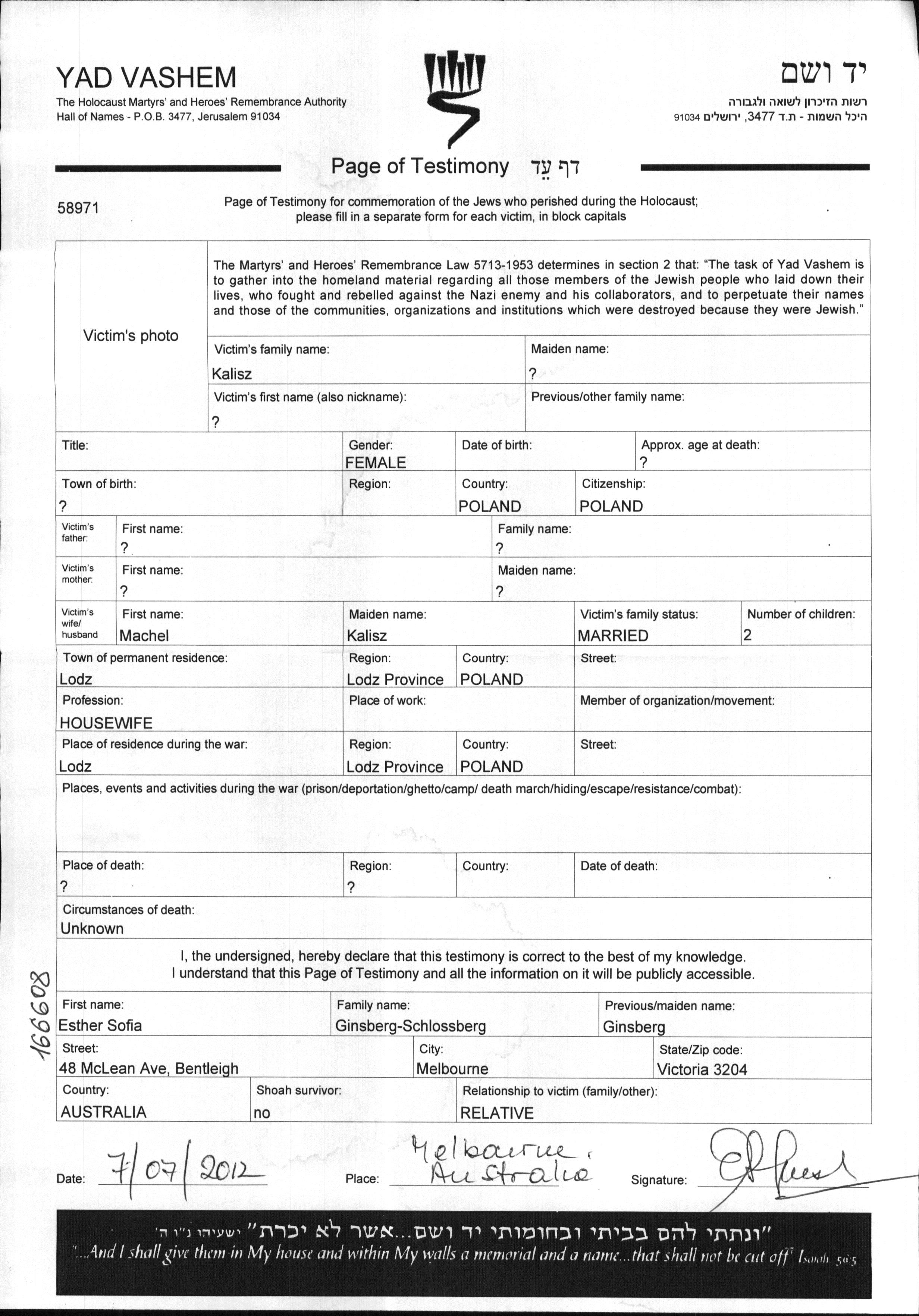 Vorname unbekannt Kalisz wurde in Polen geboren. Sie war Hausfrau. Vor dem Zweiten Weltkrieg lebte sie in Łódź, Polen.