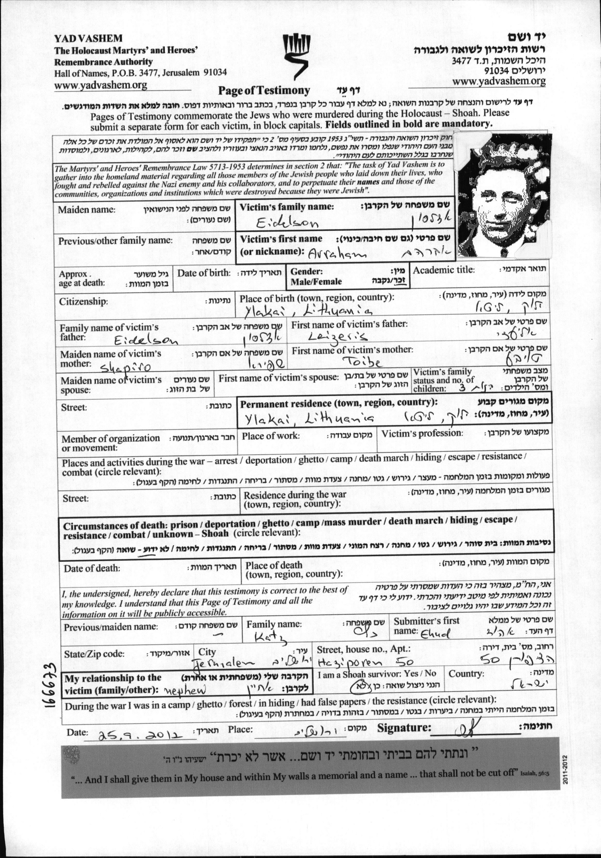 Avraham Eidelson wurde im Jahr 1898 in Ylakiai, Litauen geboren. Vor dem Zweiten Weltkrieg lebte er in Ylakiai, Litauen.