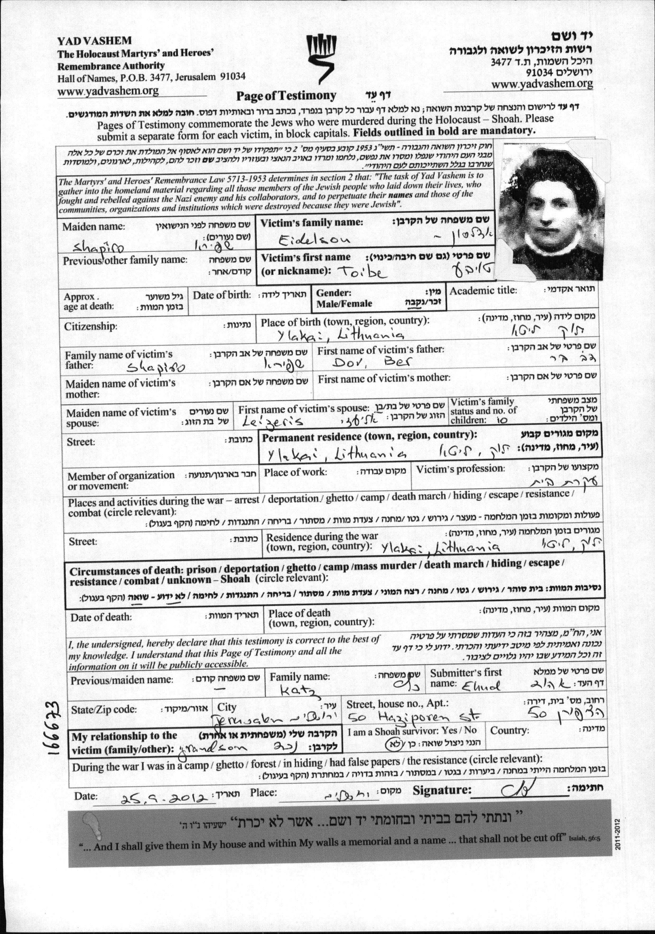 Toibe Eidelson, geb. Shapiro wurde im Jahr 1885 in Ylakiai, Litauen geboren. Sie war Hausfrau. Vor dem Zweiten Weltkrieg lebte sie in Ylakiai, Litauen.