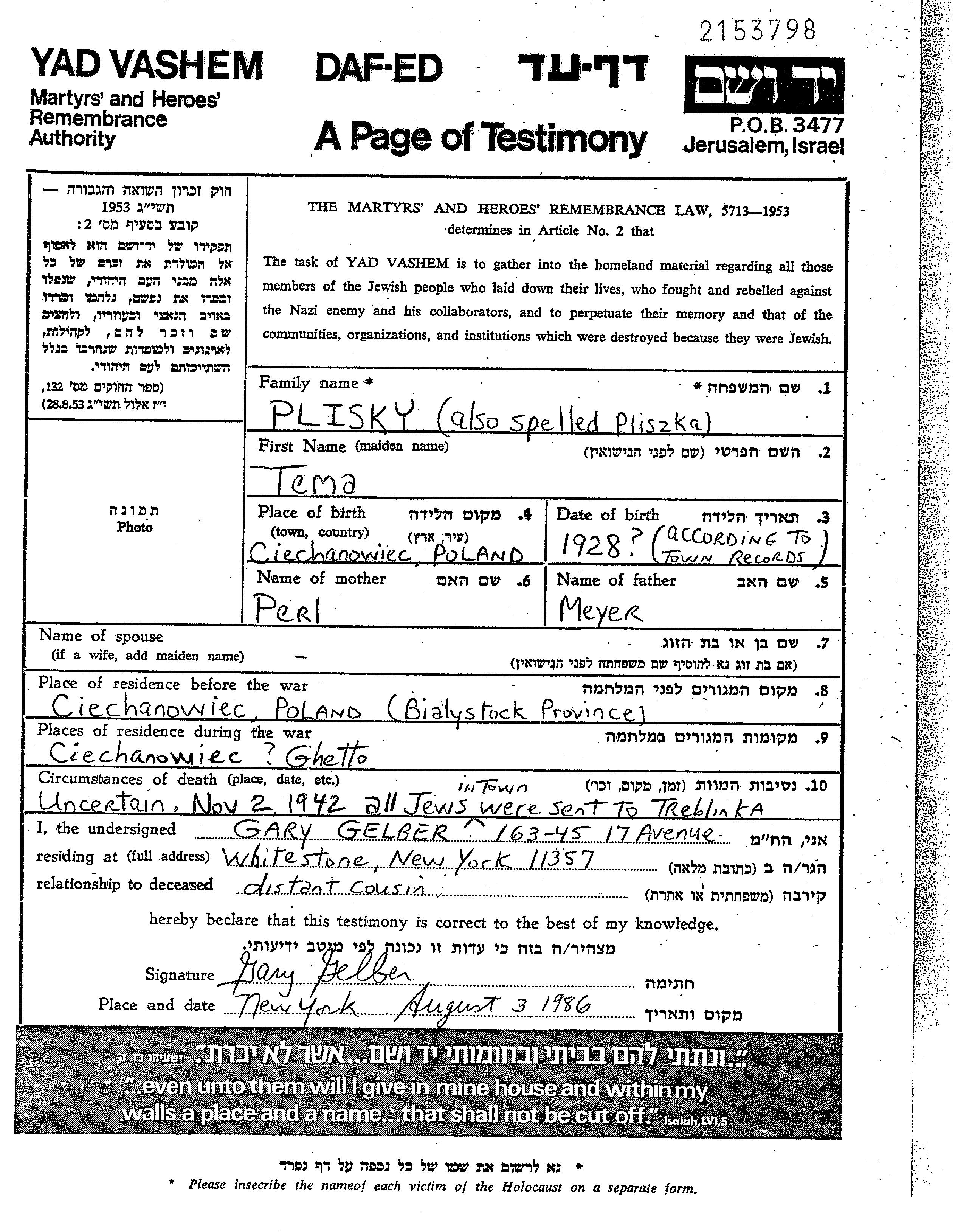 Tema Plisky Pliszka wurde im Jahr 1928 in Ciechanowiec, Polen geboren. Sie war die Tochter von Meyer und Perl. Sie war Kind. Vor dem Zweiten Weltkrieg lebte sie in Ciechanowiec, Polen. Während des Krieges war sie in Ciechanowiec, Polen.