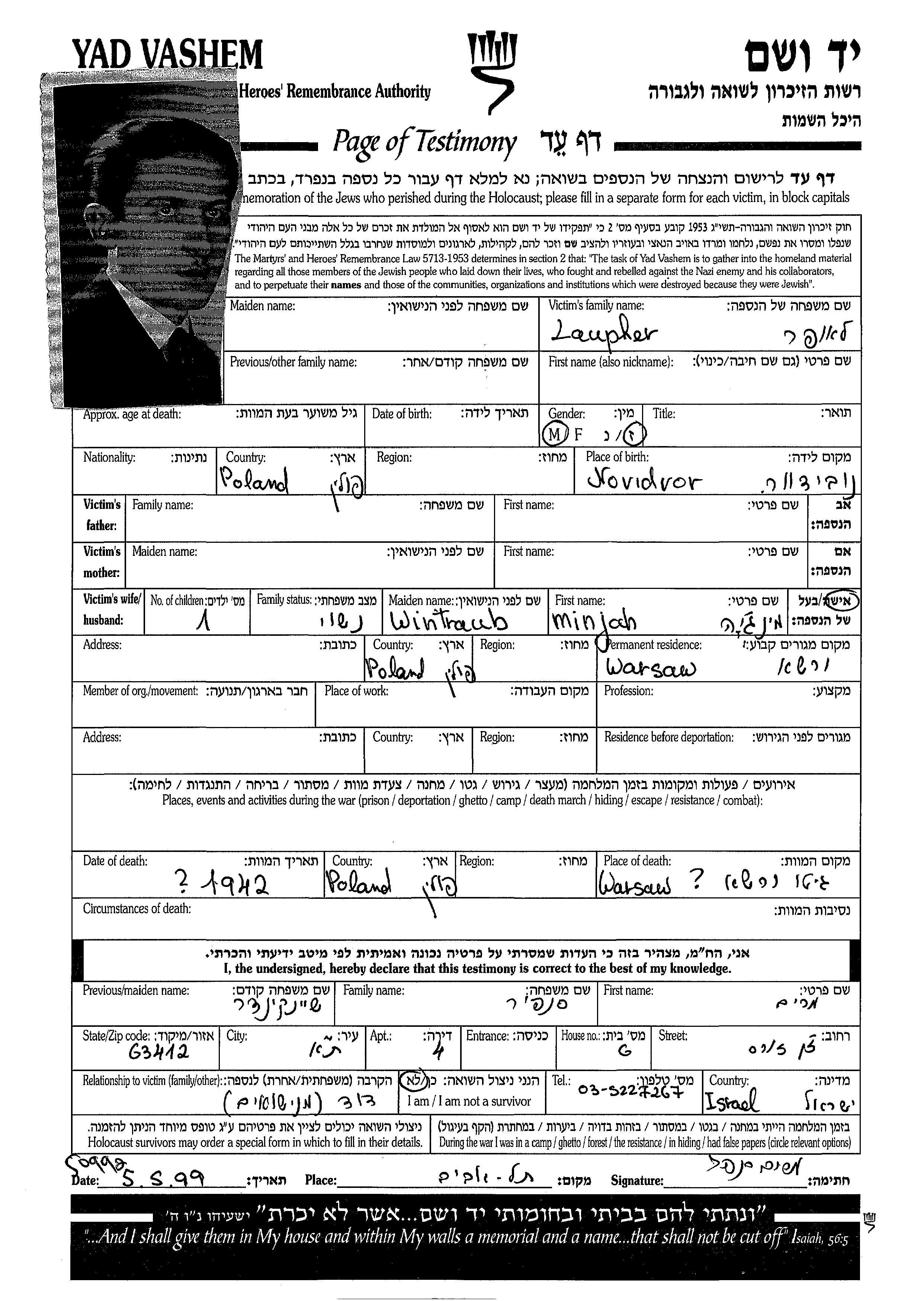Vorname unbekannt Laupher wurde in Nowy Dwor, Polen geboren. Vor dem Zweiten Weltkrieg lebte sie in Warszawa, Polen.