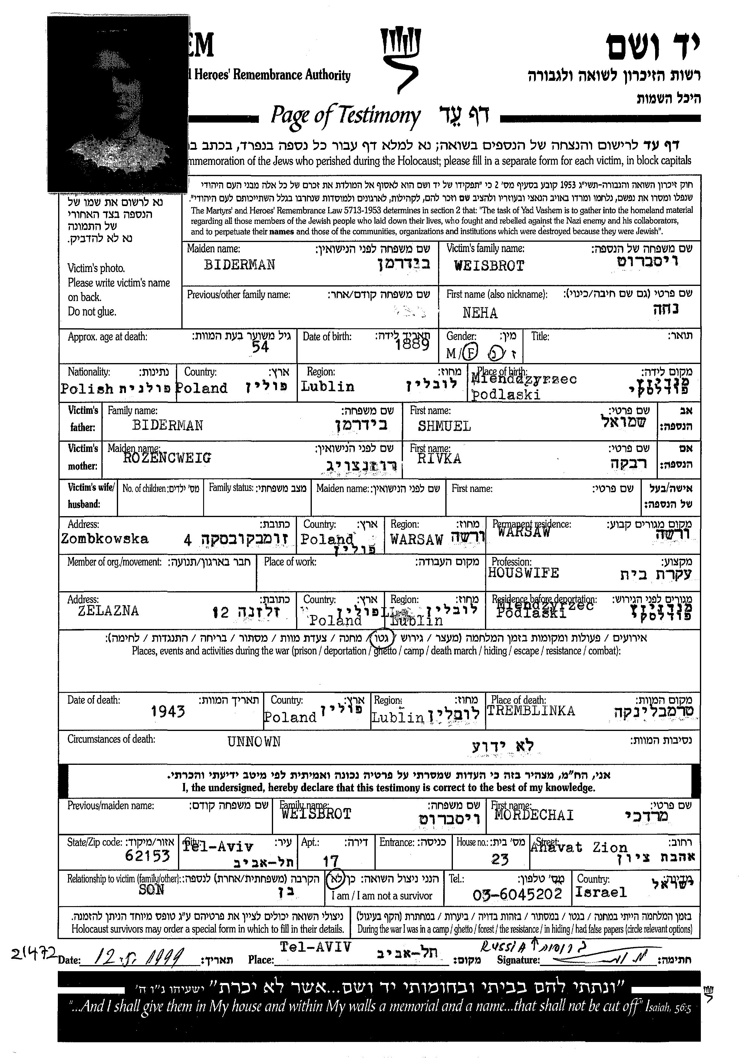 Neha Weisbrot, geb. Biderman wurde im Jahr 1889 in Miedzyrzecz, Polen geboren. Sie war Hausfrau. Vor dem Zweiten Weltkrieg lebte sie in Warszawa, Polen.