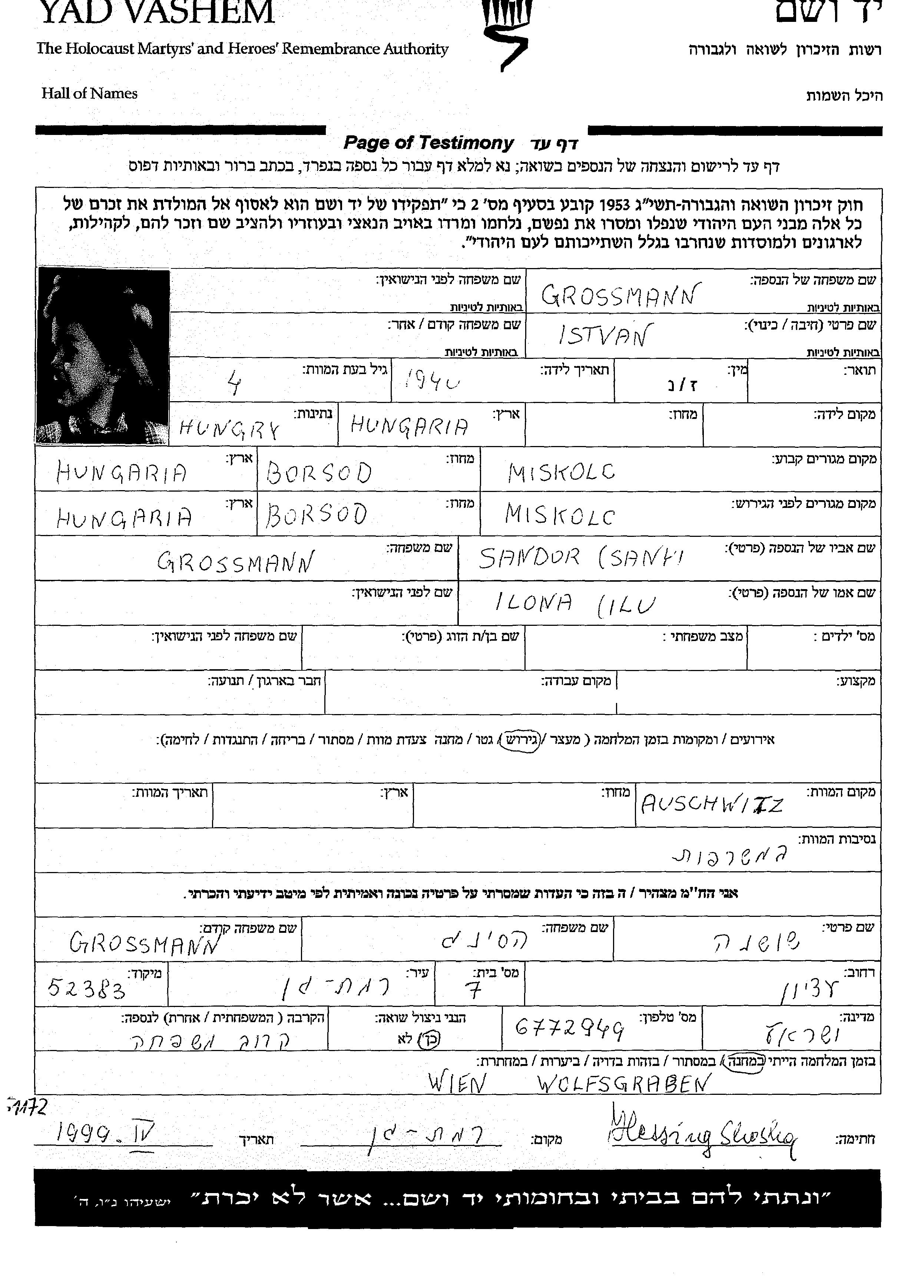 Grossmann Ishtvan 1940 Miskolc, Ungarn Gedenkblatt