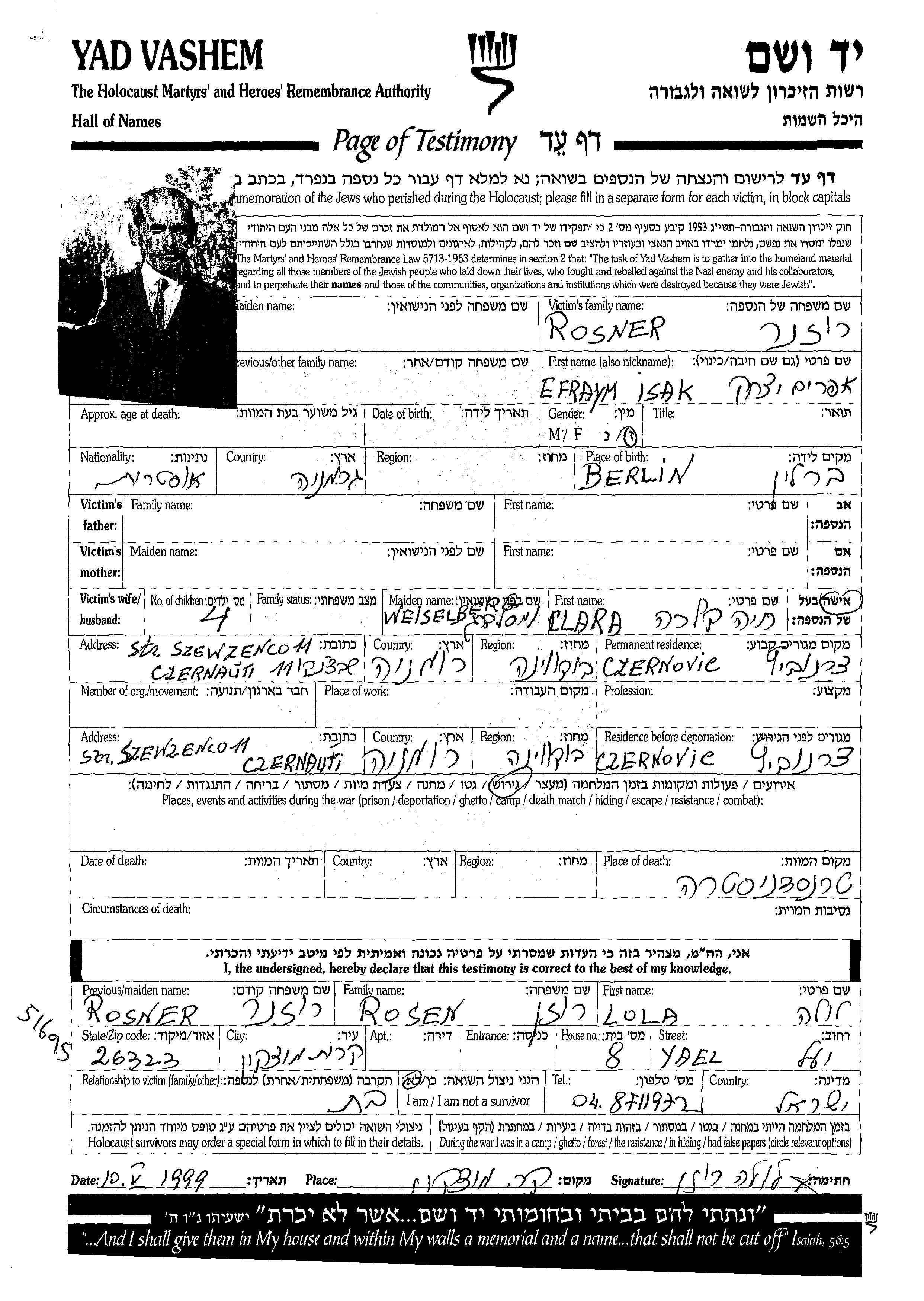 Efraym Isak Rosner wurde in Berlin, Deutsches Reich geboren. Vor dem Zweiten Weltkrieg lebte er in Cernauti, Rumänien.