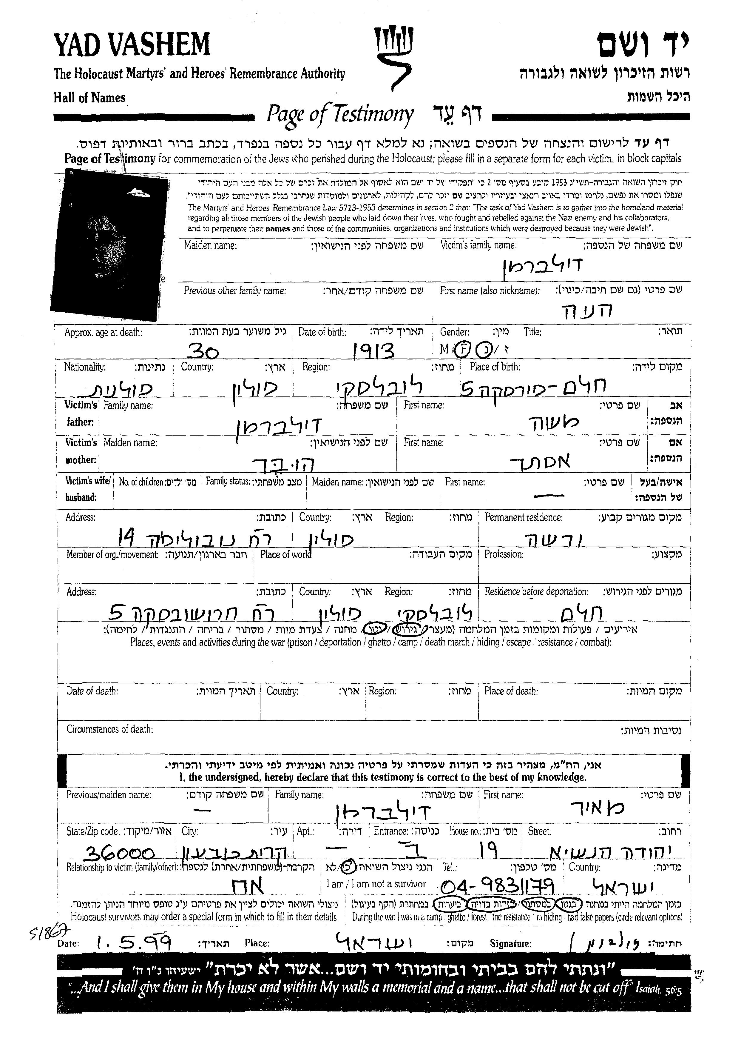Henia Zilberman wurde im Jahr 1913 in Chelm, Polen geboren. Vor dem Zweiten Weltkrieg lebte sie in Warszawa, Polen.
