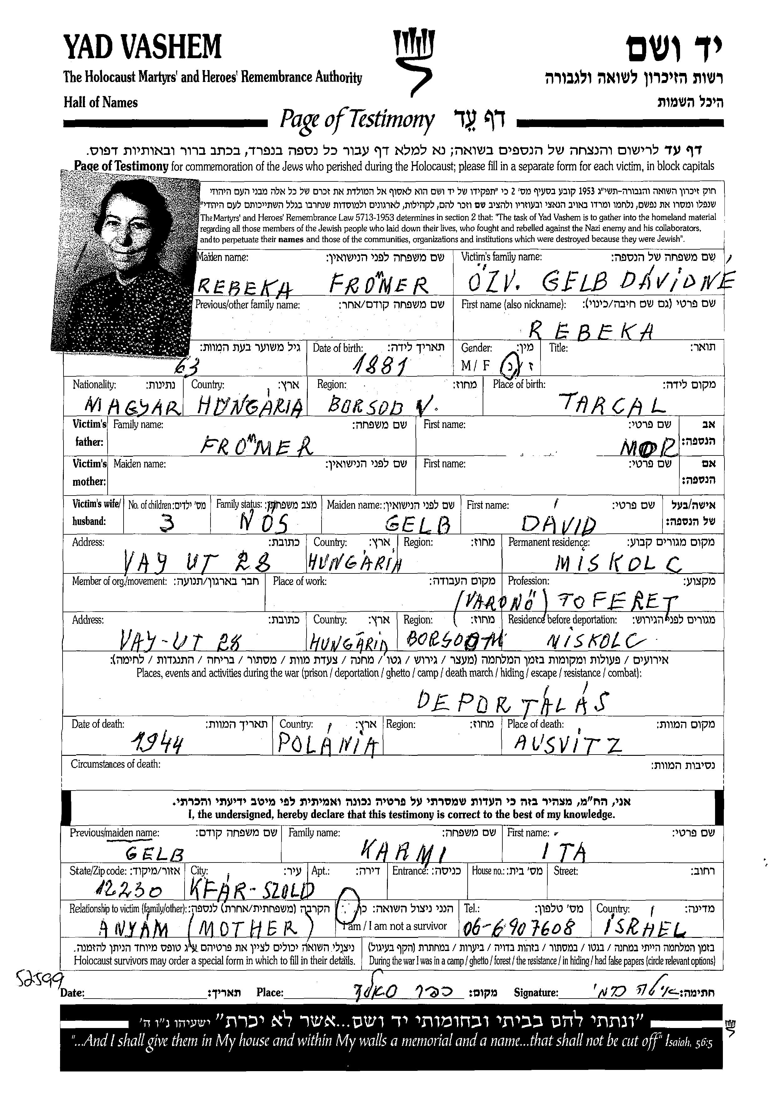 Rebeka Gelb, geb. Proner wurde im Jahr 1881 in Tarcal, Ungarn geboren. Sie war Schneiderin. Vor dem Zweiten Weltkrieg lebte sie in Miskolc, Ungarn.