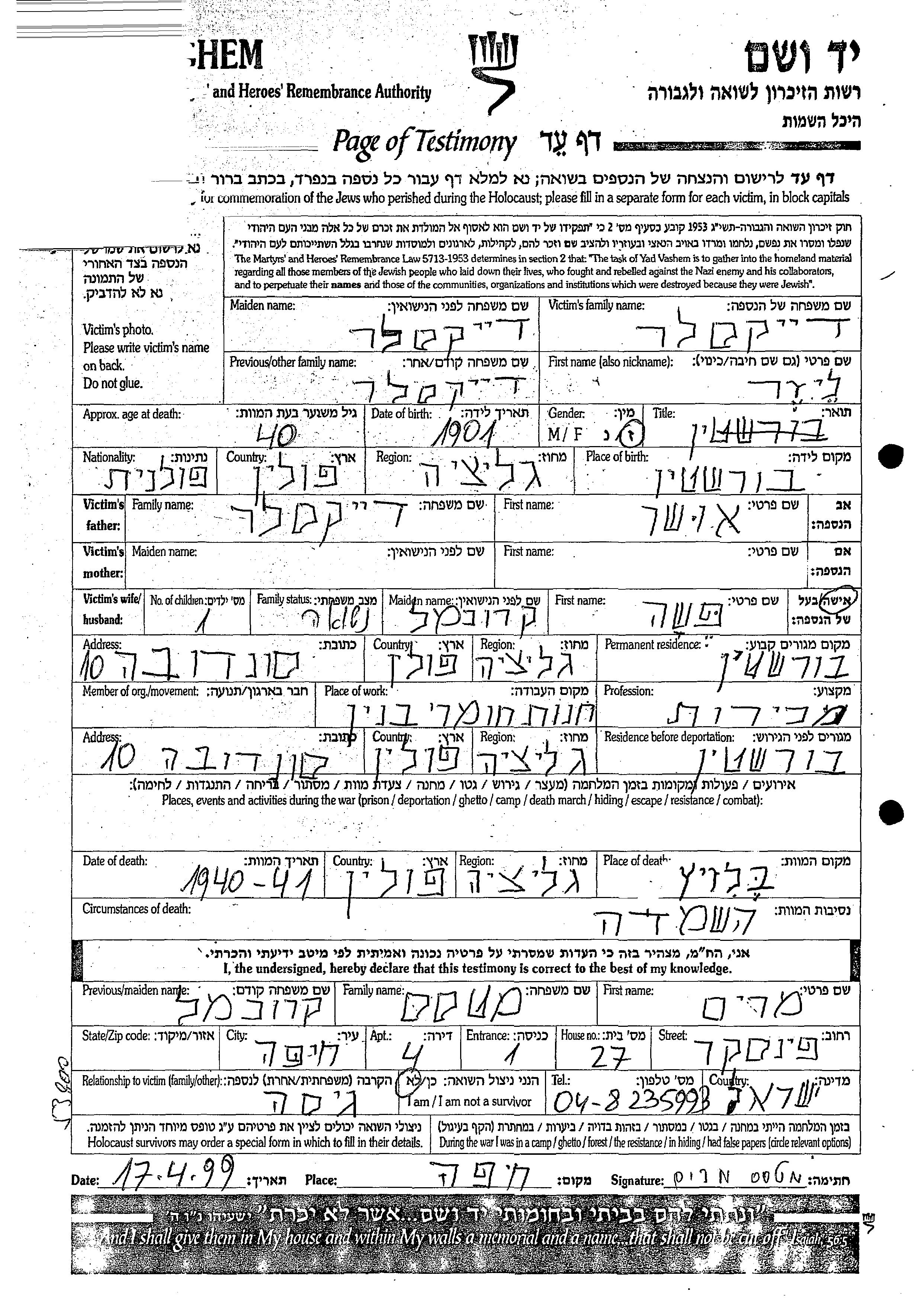 Eliezer wurde in der Schoah ermordet. Todesort: Belzec, Polen im Jahr 1940.