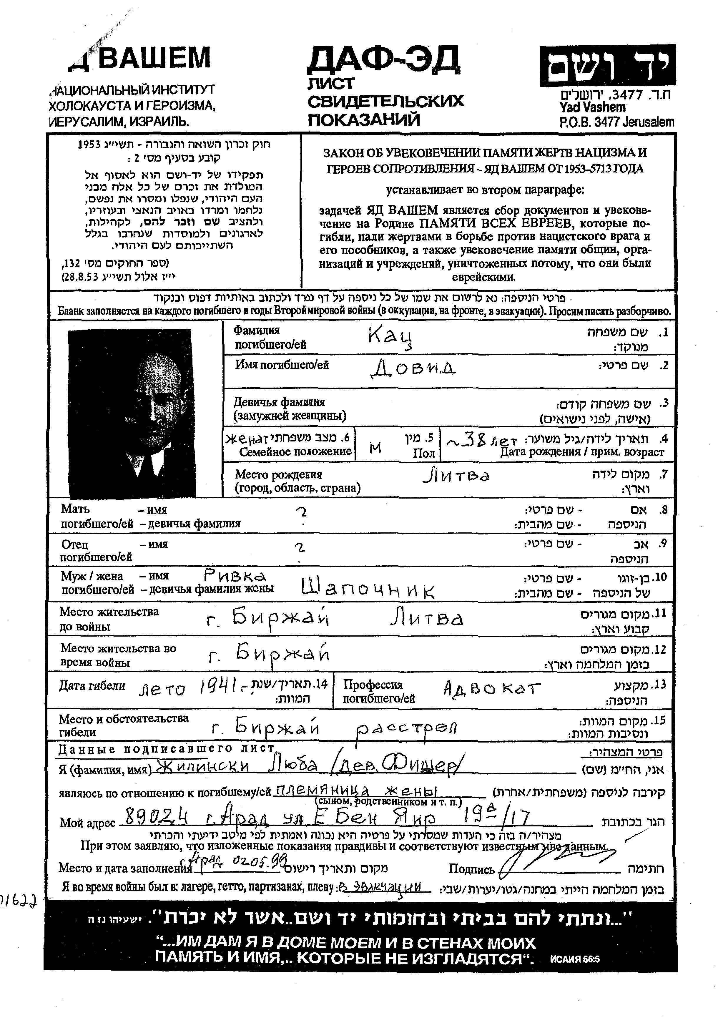 Katz Dovid Birzhay, Litauen Gedenkblatt