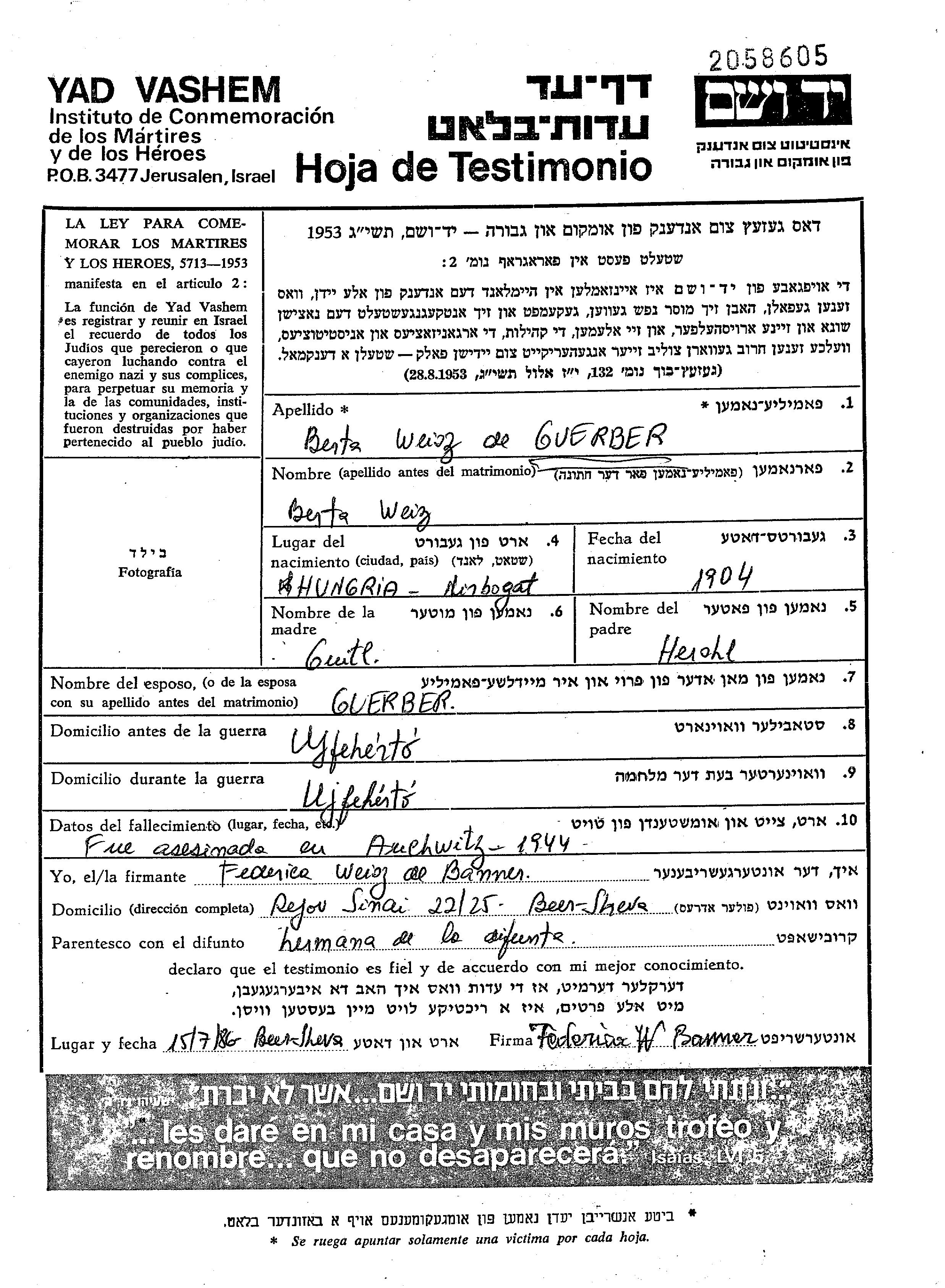 Berta Guerber Graber, geb. Weisz wurde im Jahr 1904 in Nyirbogat, Ungarn geboren. Sie war die Tochter von Hershl und Guitl Gutl. Sie war Verheiratet. Vor dem Zweiten Weltkrieg lebte sie in Ujfeherto, Ungarn. Während des Krieges war sie in Ujfeherto, Ungarn.