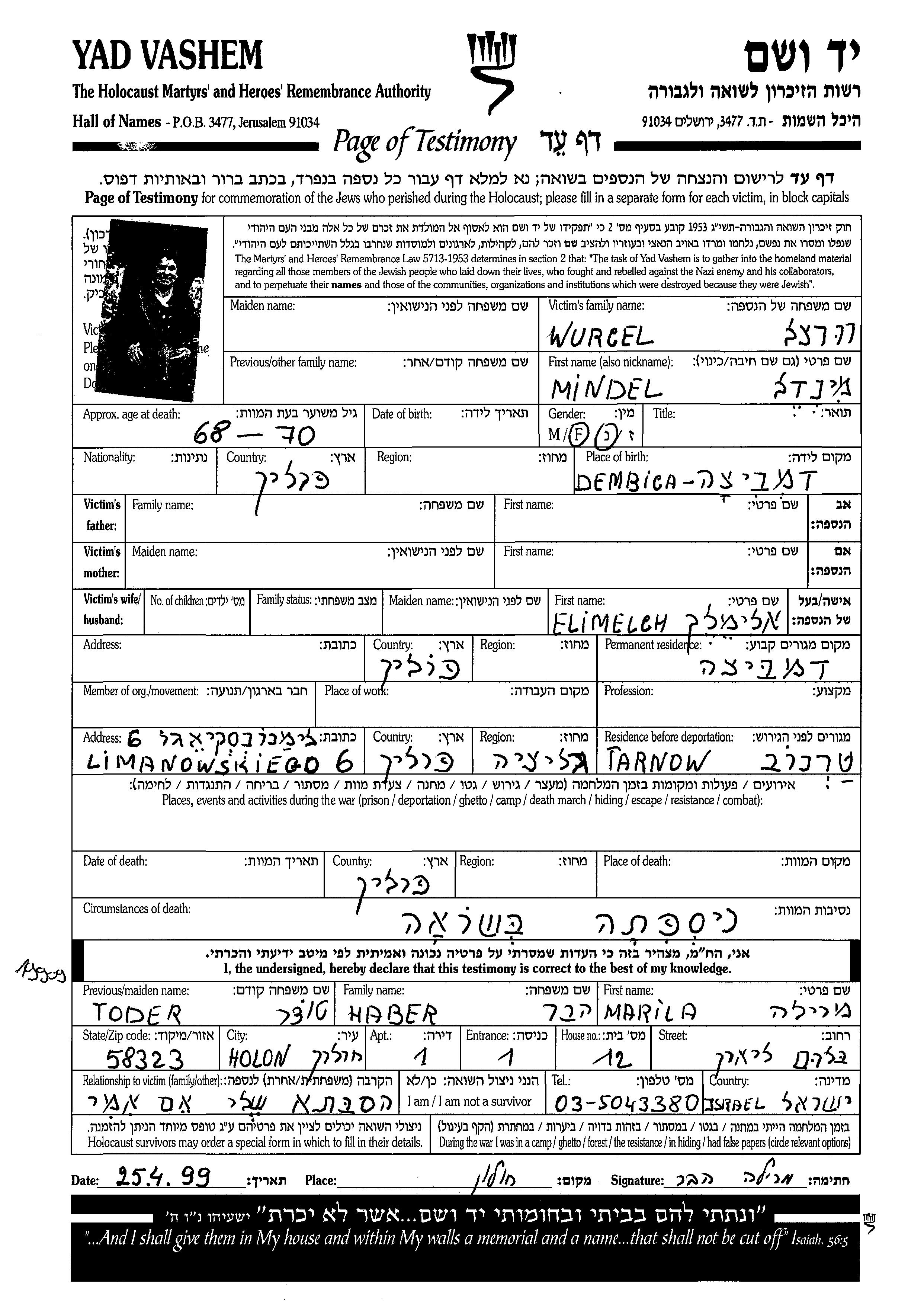 Mindl Wurcel wurde in Debica, Polen geboren. Vor dem Zweiten Weltkrieg lebte sie in Debica, Polen.