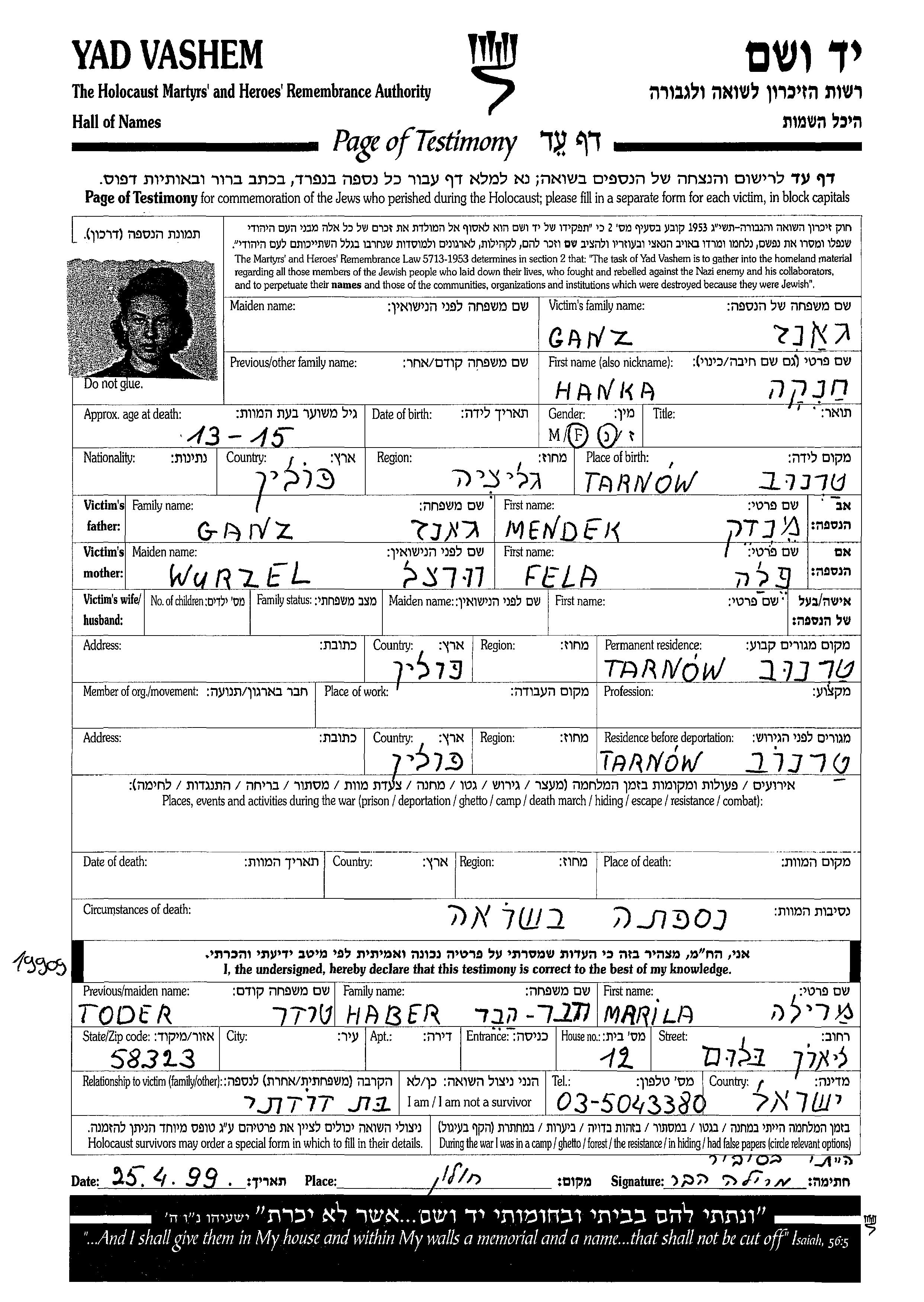 Hanka Ganz wurde in Tarnow, Polen geboren. Vor dem Zweiten Weltkrieg lebte sie in Tarnow, Polen.