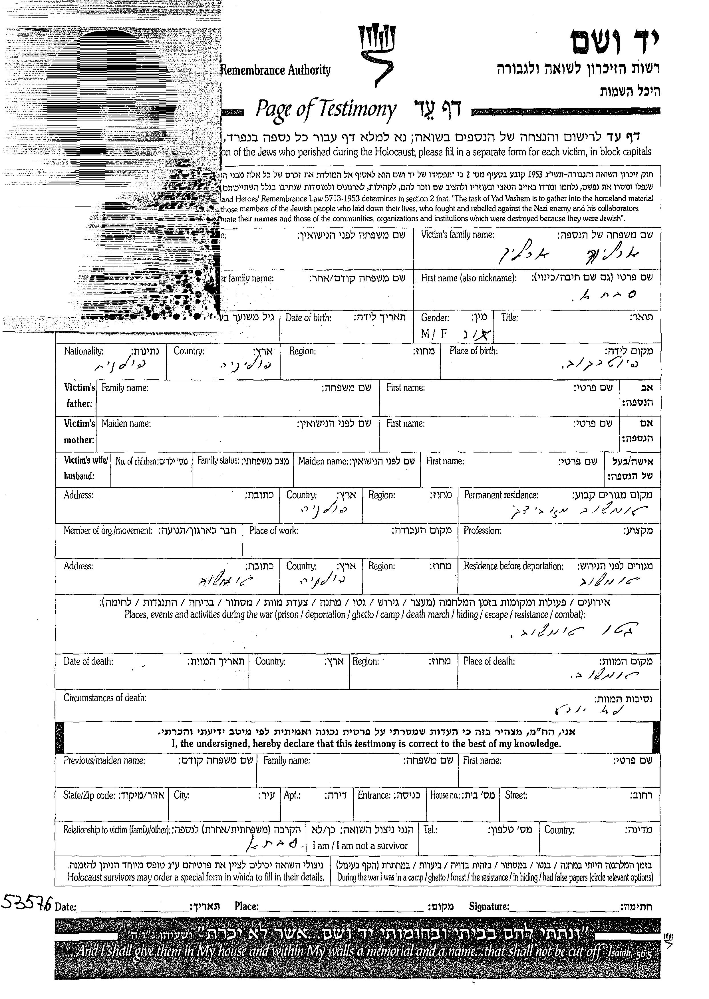 Vorname unbekannt Erlikh wurde in Piotrkow, Polen geboren. Vor dem Zweiten Weltkrieg lebte sie in Tomaszow Mazowiecki, Polen.