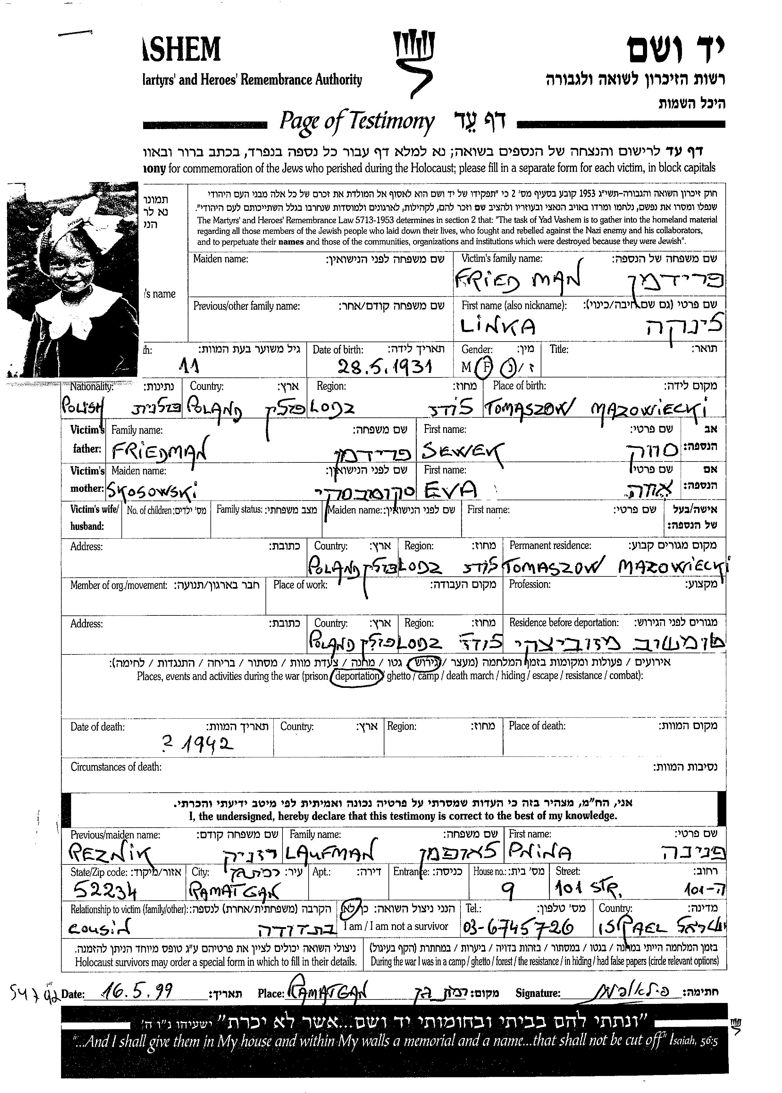 | Friedman | Linka | 1931 | Tomaszow Mazowiecki, Polen | Photos |