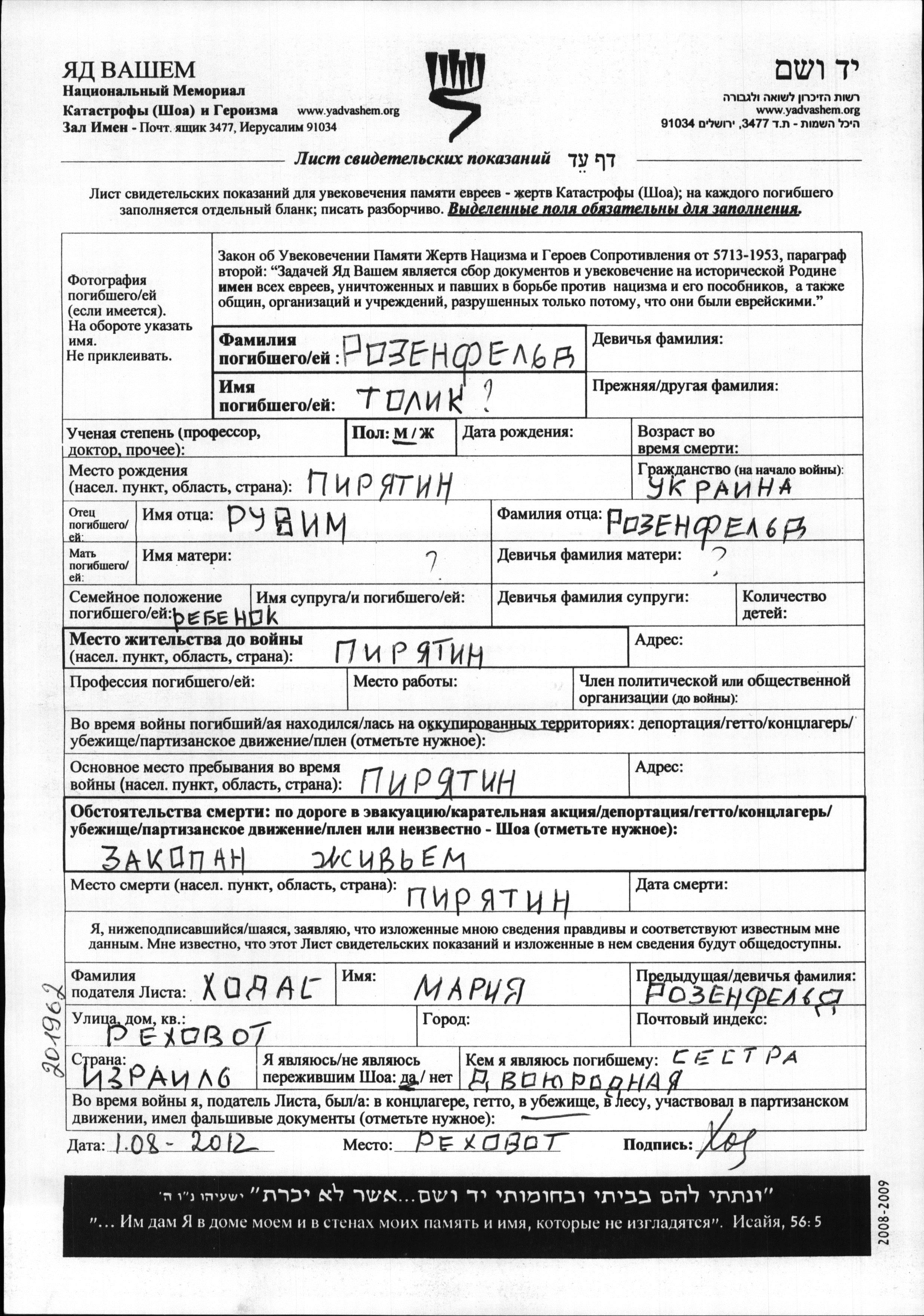 | Rozenfeld | Tolik | Piryatin, Ukraine (UdSSR) | Gedenkblatt | |