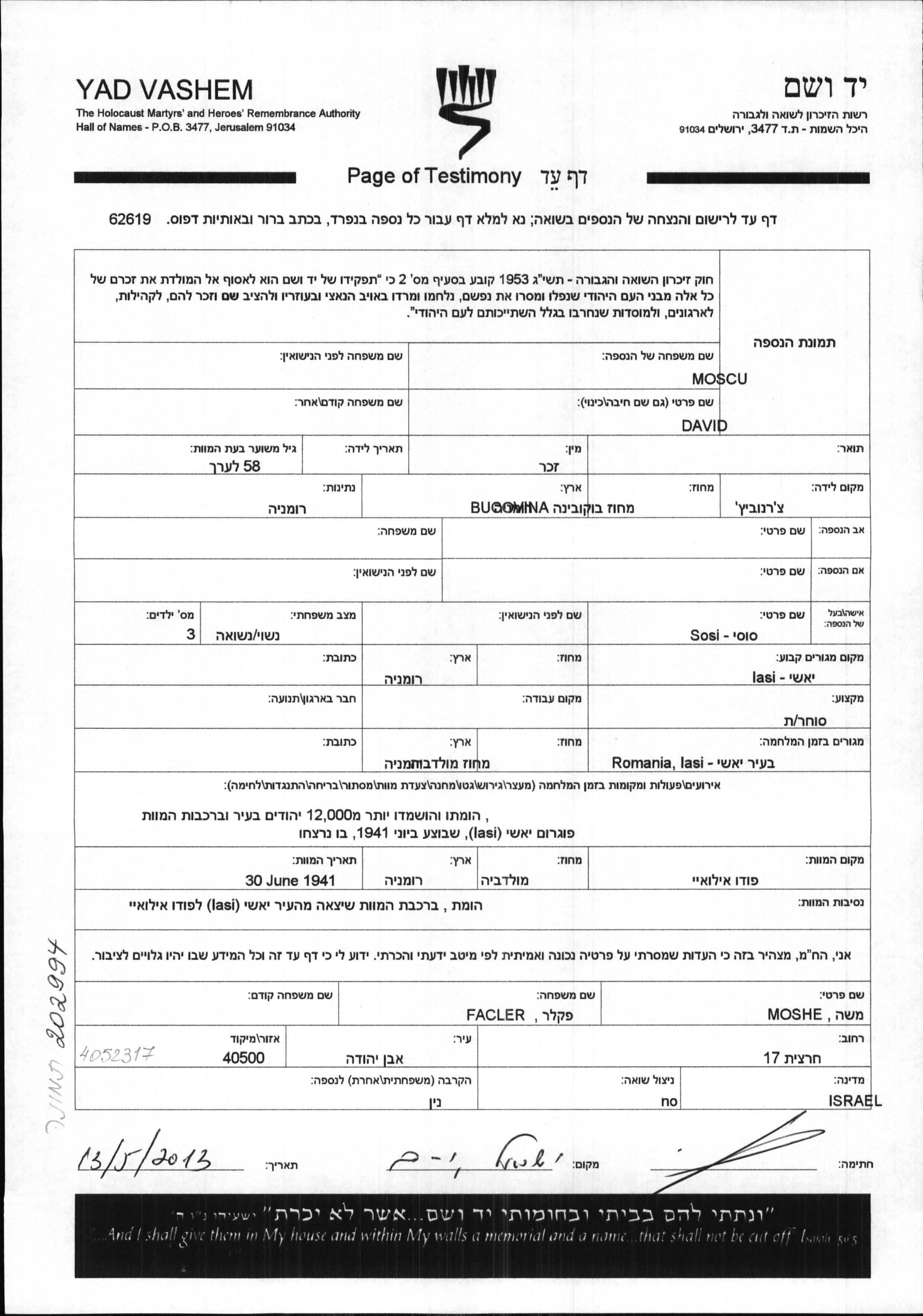 David wurde in der Schoah ermordet. Todesort: Podul Iloaiei, Rumänien im Jahr 30/6/1941.