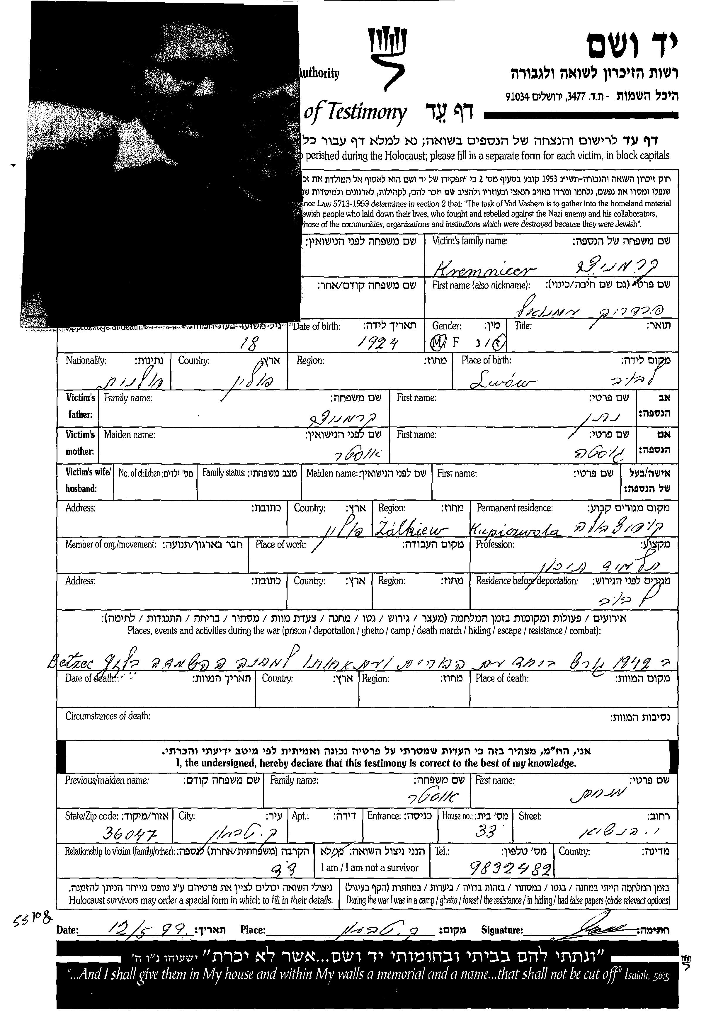 Kremnicer | Frederik Emanuel | 1924 | Kupiczwola, Polen | Gedenkblatt |