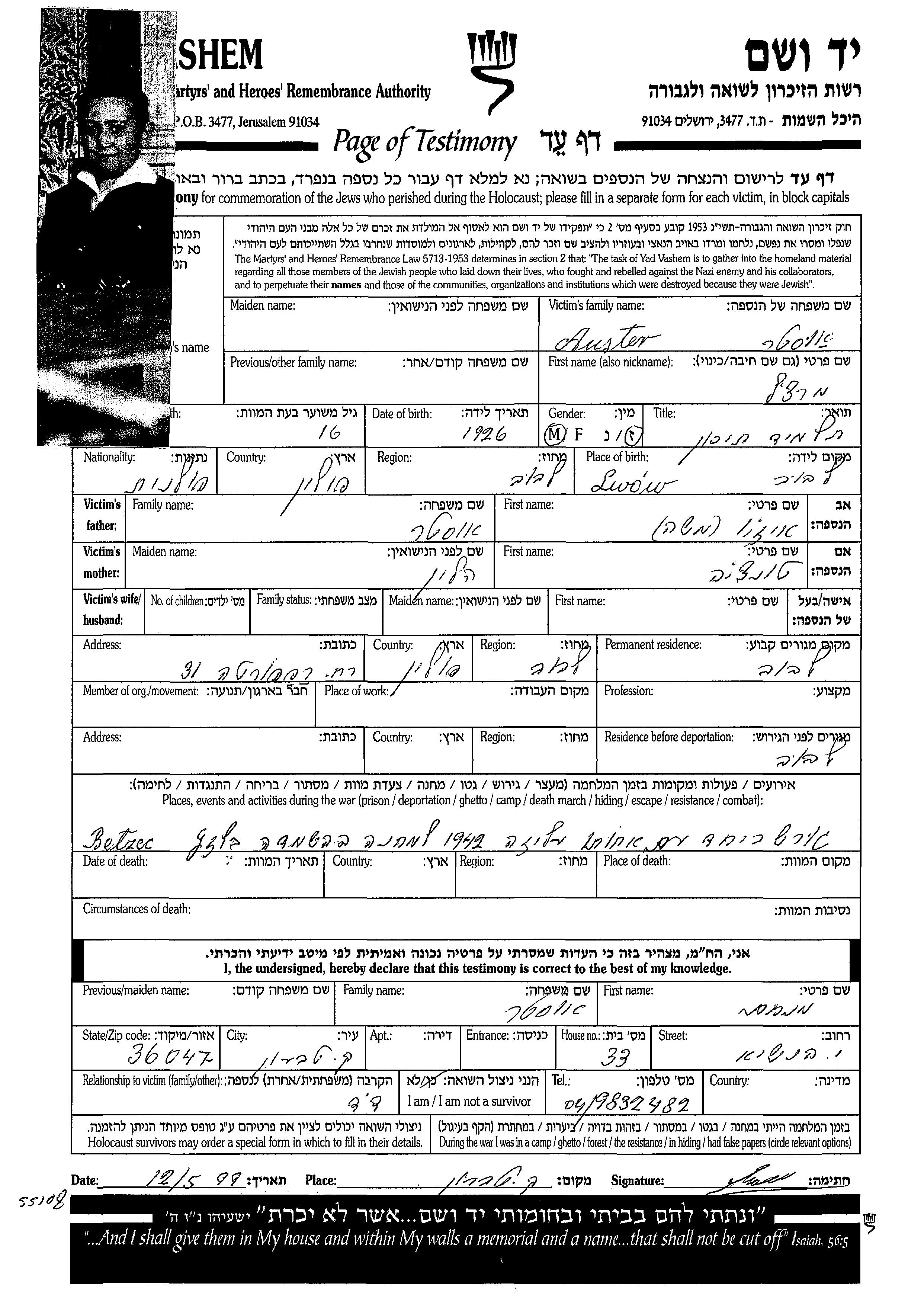 Marchel Auster Oster wurde im Jahr 1926 in Lwow, Polen geboren. Er war Gymnasiast. Vor dem Zweiten Weltkrieg lebte er in Lwow, Polen.