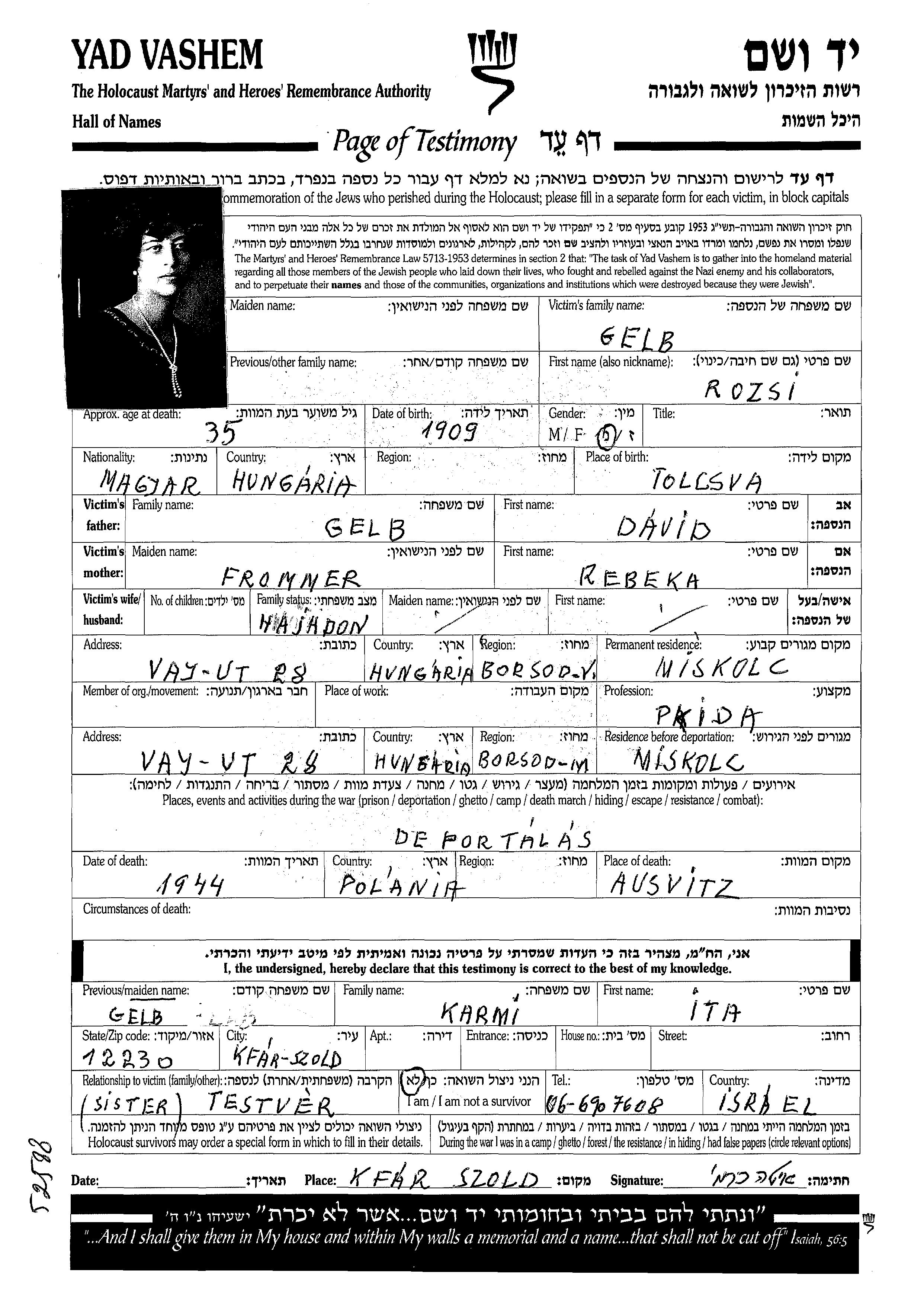 Rozsi Gelb wurde im Jahr 1909 in Tolcsva, Ungarn geboren. Sie war Angestellte/-r. Vor dem Zweiten Weltkrieg lebte sie in Miskolc, Ungarn.