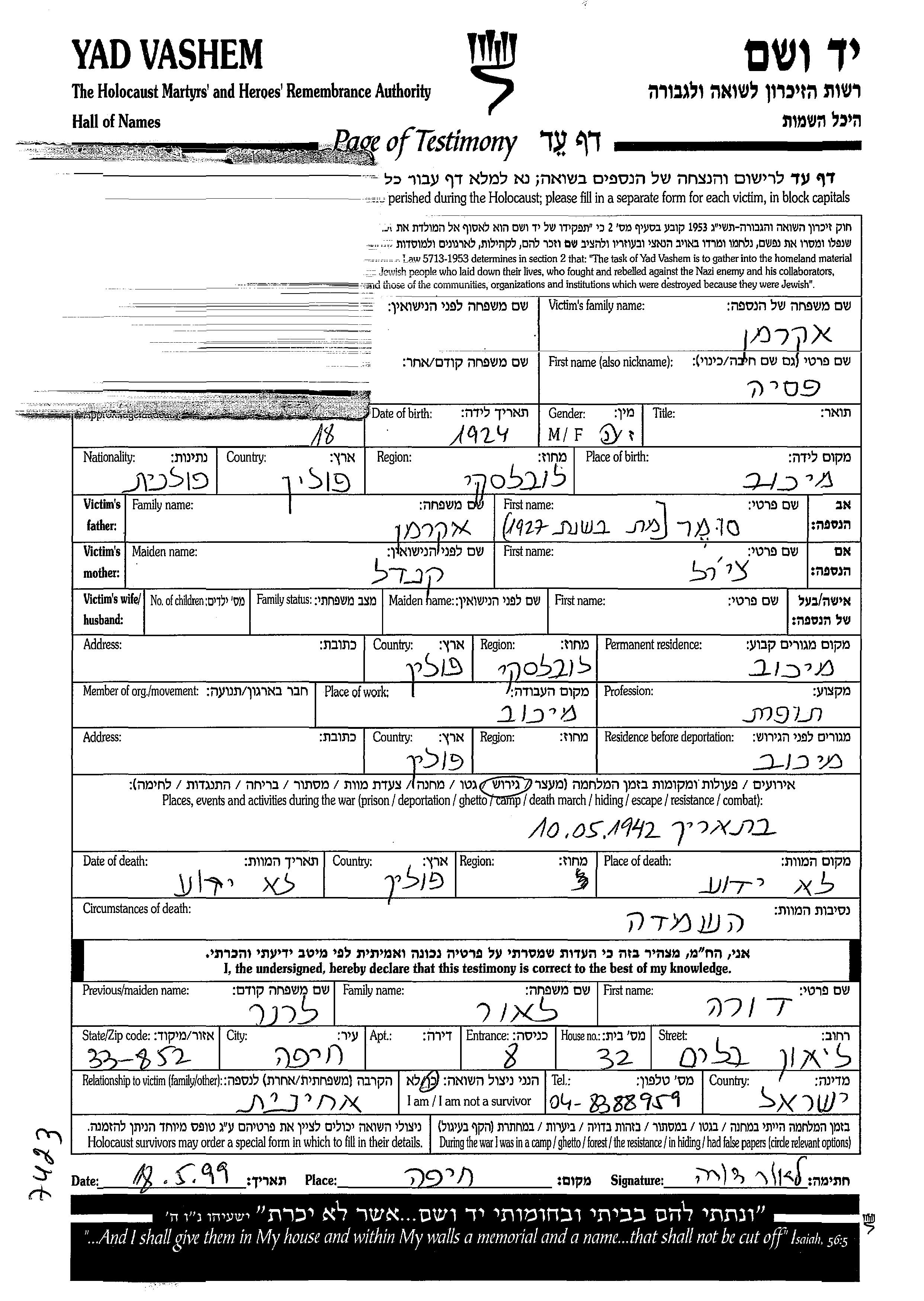 Pesia Akerman wurde im Jahr 1924 in Michow, Polen geboren. Sie war Schneiderin. Vor dem Zweiten Weltkrieg lebte sie in Michow, Polen.