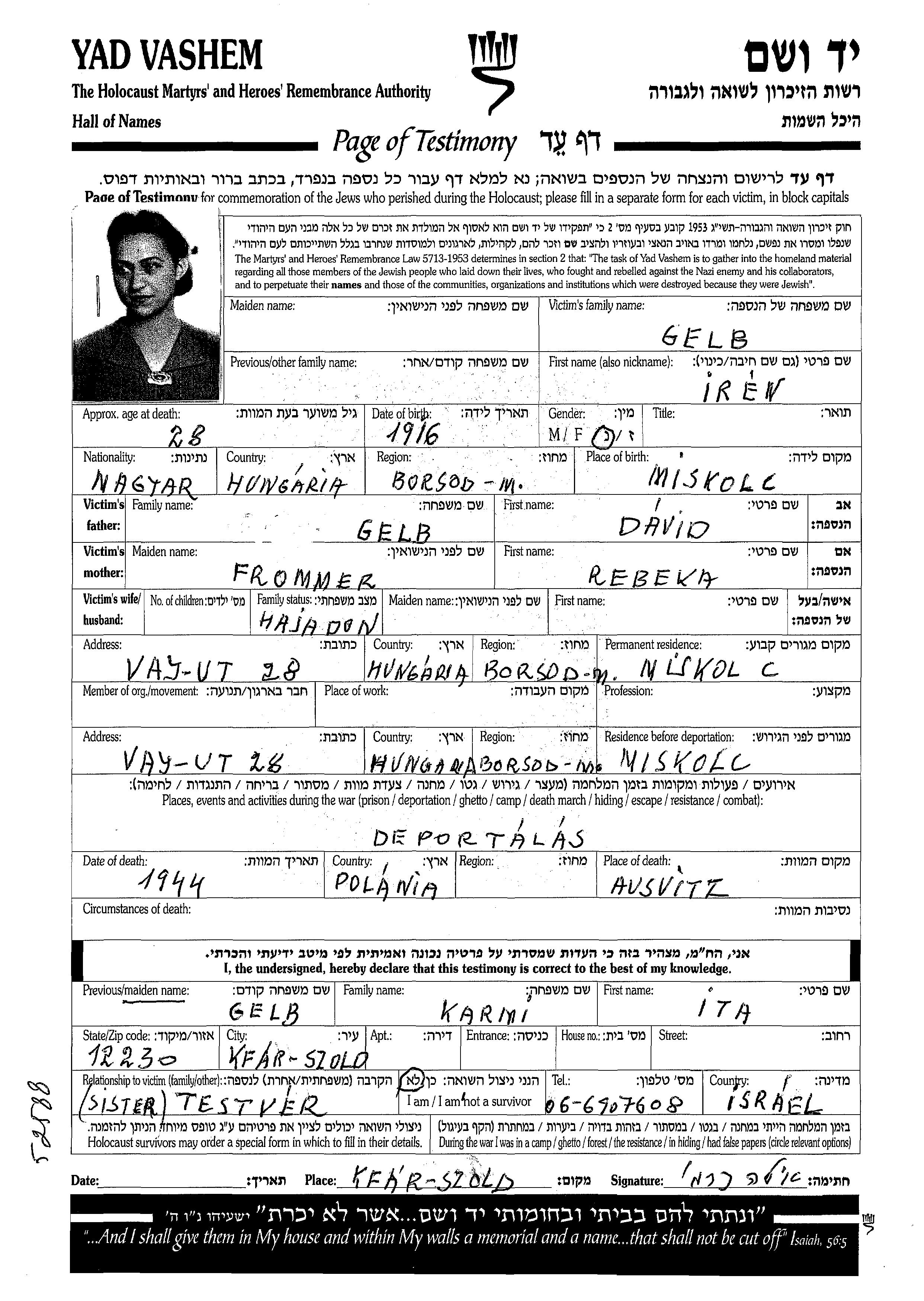Iren Gelb wurde im Jahr 1916 in Miskolc, Ungarn geboren. Vor dem Zweiten Weltkrieg lebte sie in Miskolc, Ungarn.