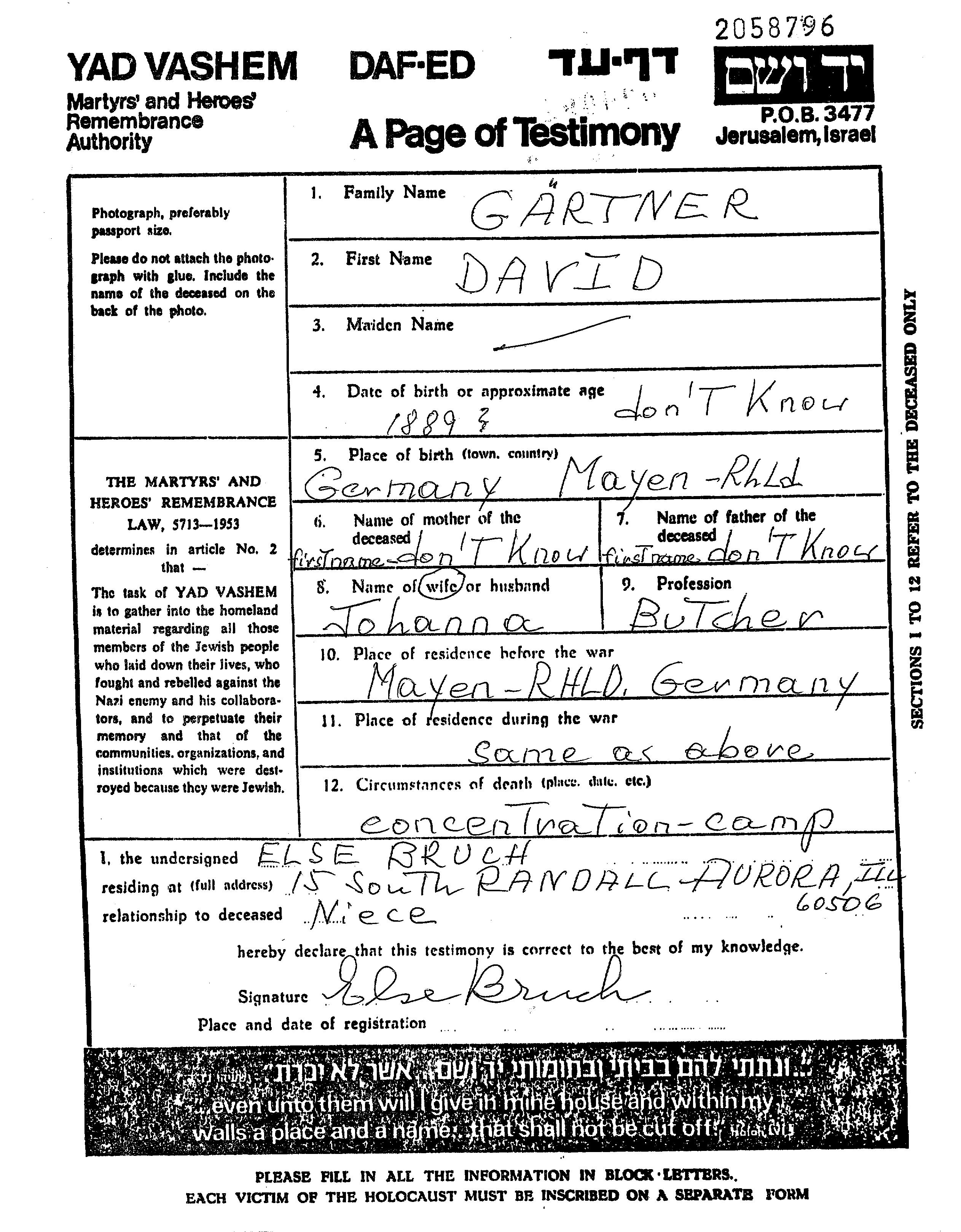 David Gärtner wurde im Jahr 1889 in Mayen, Deutsches Reich geboren. Er war Metzger/-in und mit Johanna Verheiratet. Vor dem Zweiten Weltkrieg lebte er in Mayen, Deutsches Reich. Während des Krieges war er in Mayen, Deutsches Reich.