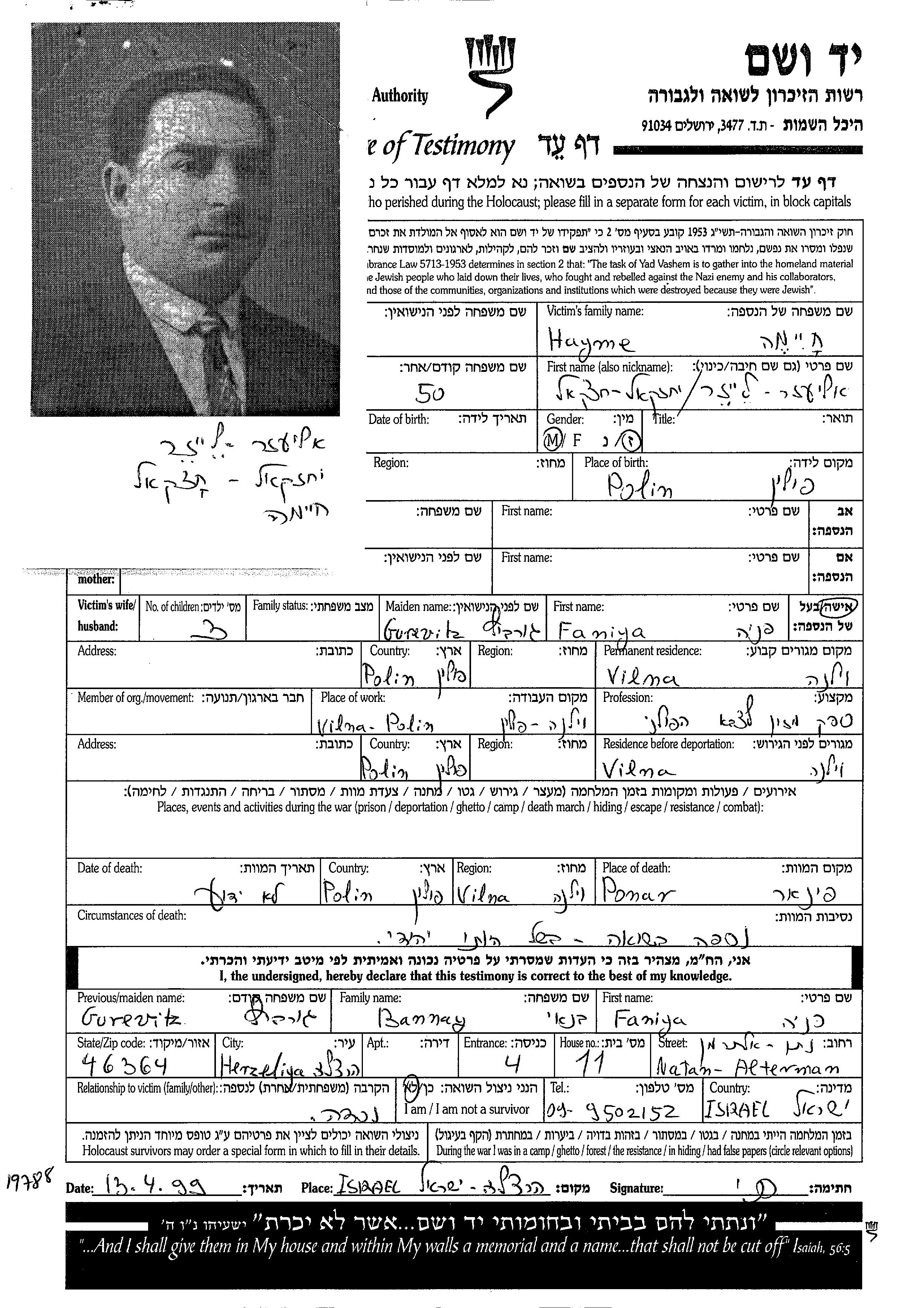 Hayme | Eliezer Yekhezkel | Vilna, Polen | Gedenkblatt | |