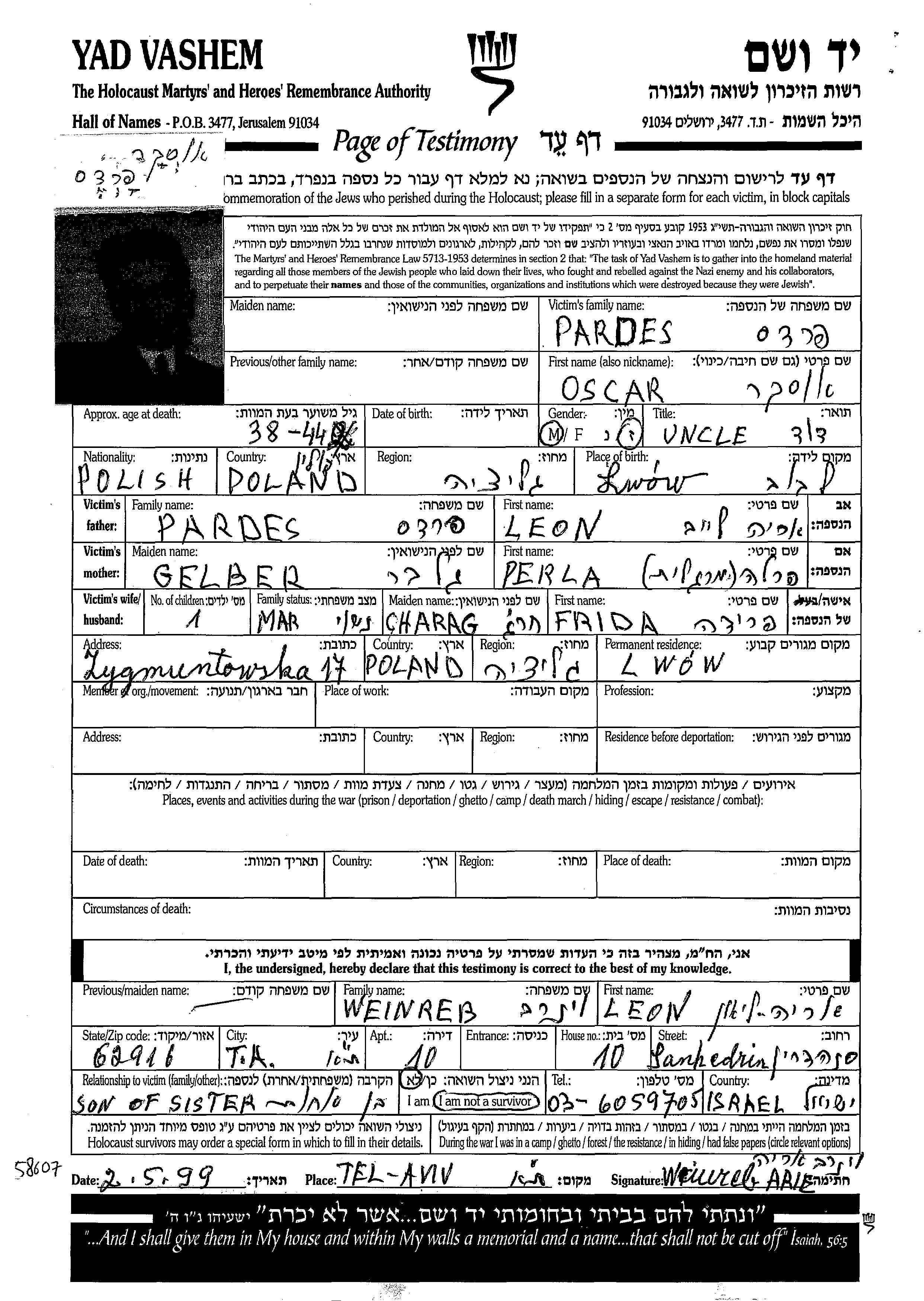 Oscar Pardes wurde in Lwow, Polen geboren. Vor dem Zweiten Weltkrieg lebte er in Lwow, Polen.