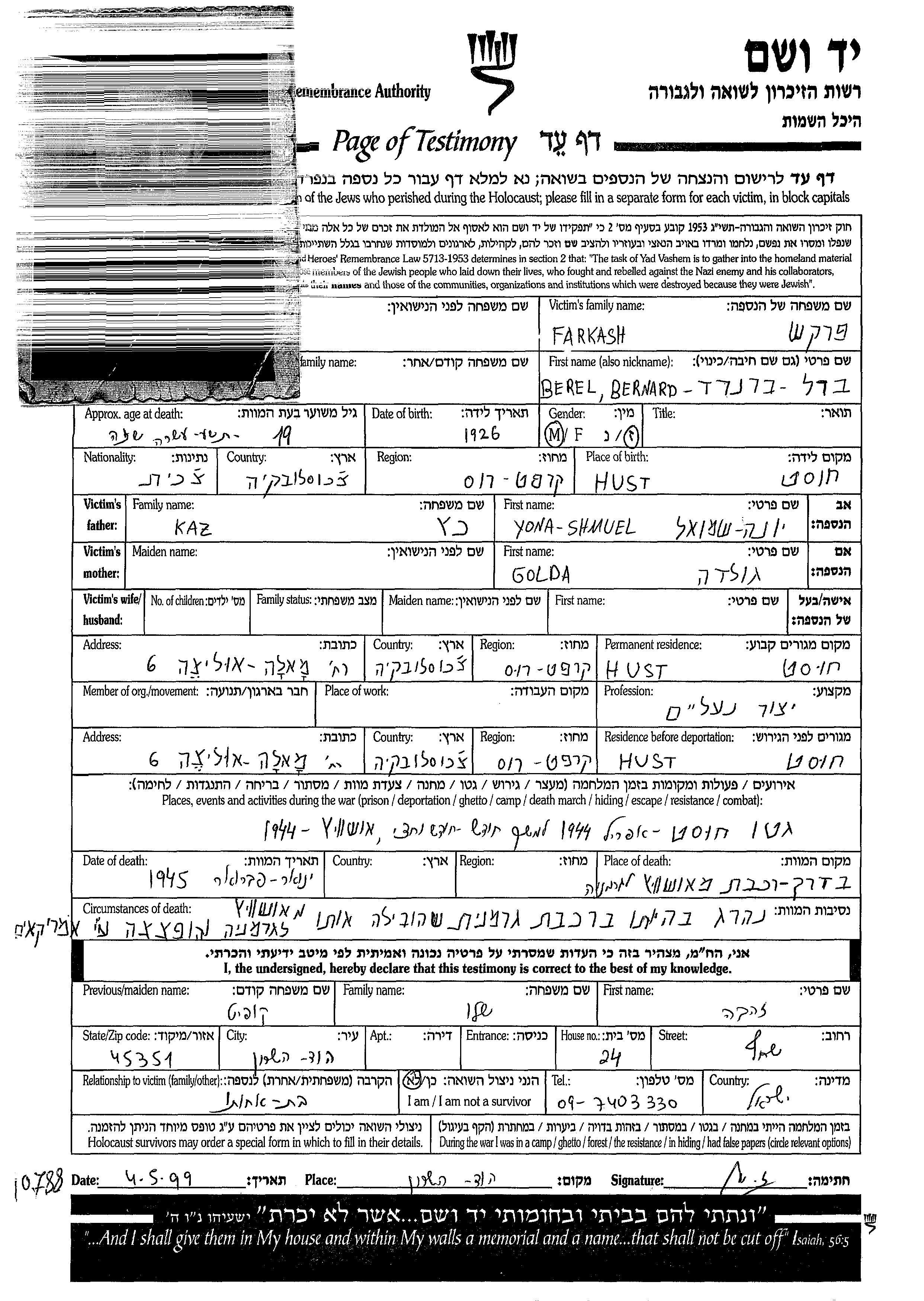 Farkash Katz | Berl Bernard | 1926 | Hust, Tschechoslowakei | Gedenkblatt |