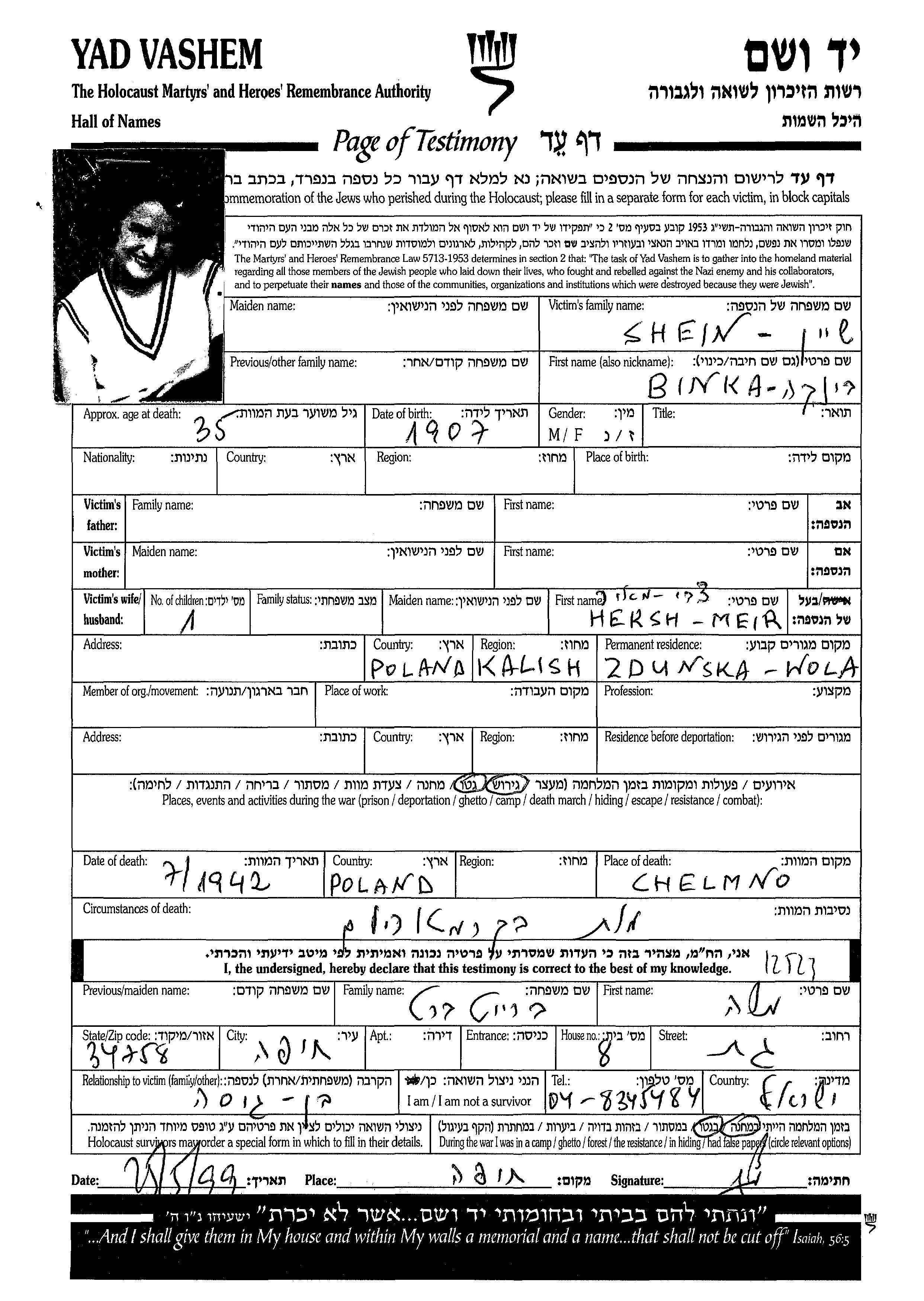 Binka Shein wurde im Jahr 1907 geboren. Vor dem Zweiten Weltkrieg lebte sie in Zdunska Wola, Polen.