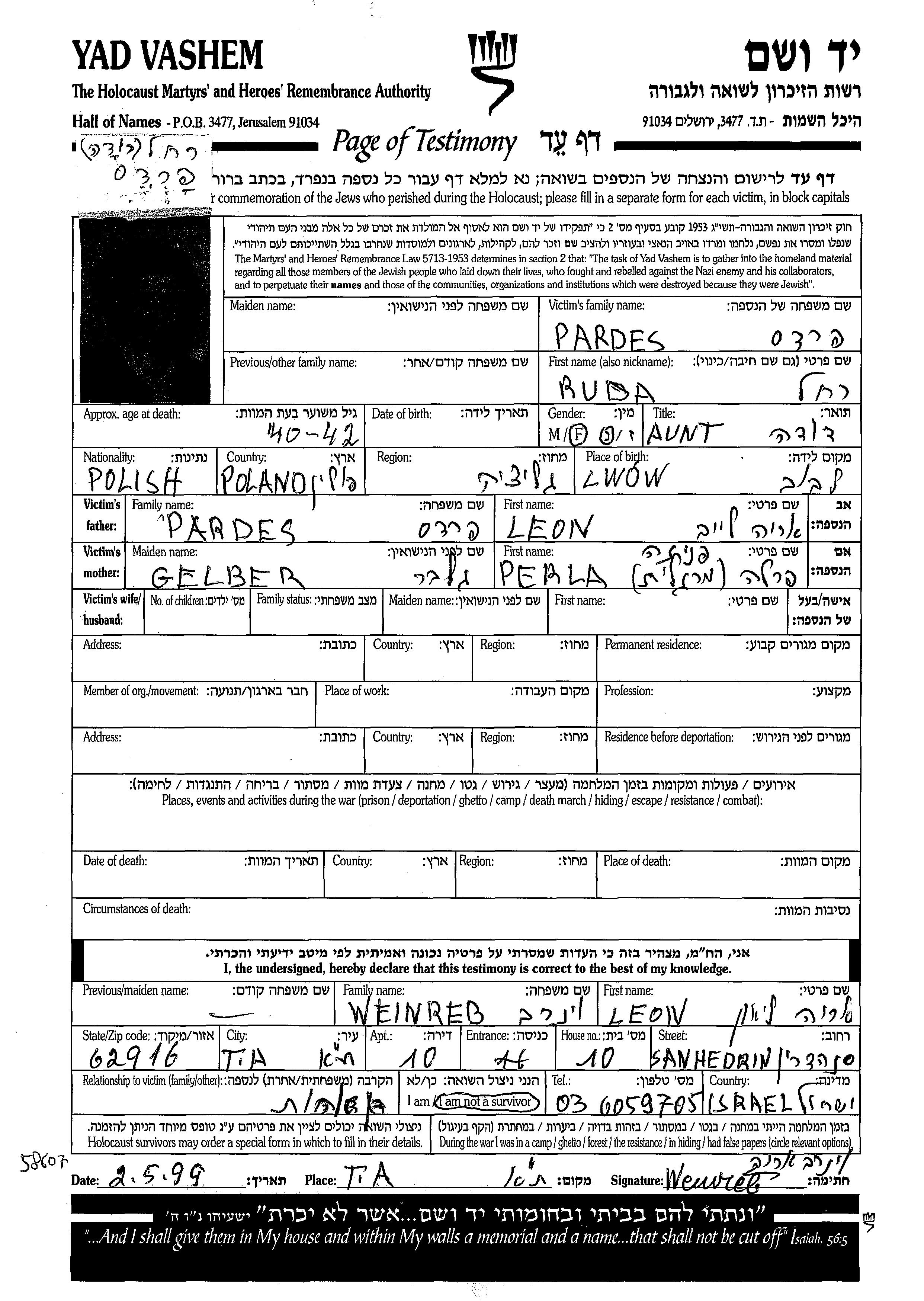 Pardes Roda Rakhel unbekannter Ort, Gedenkblatt