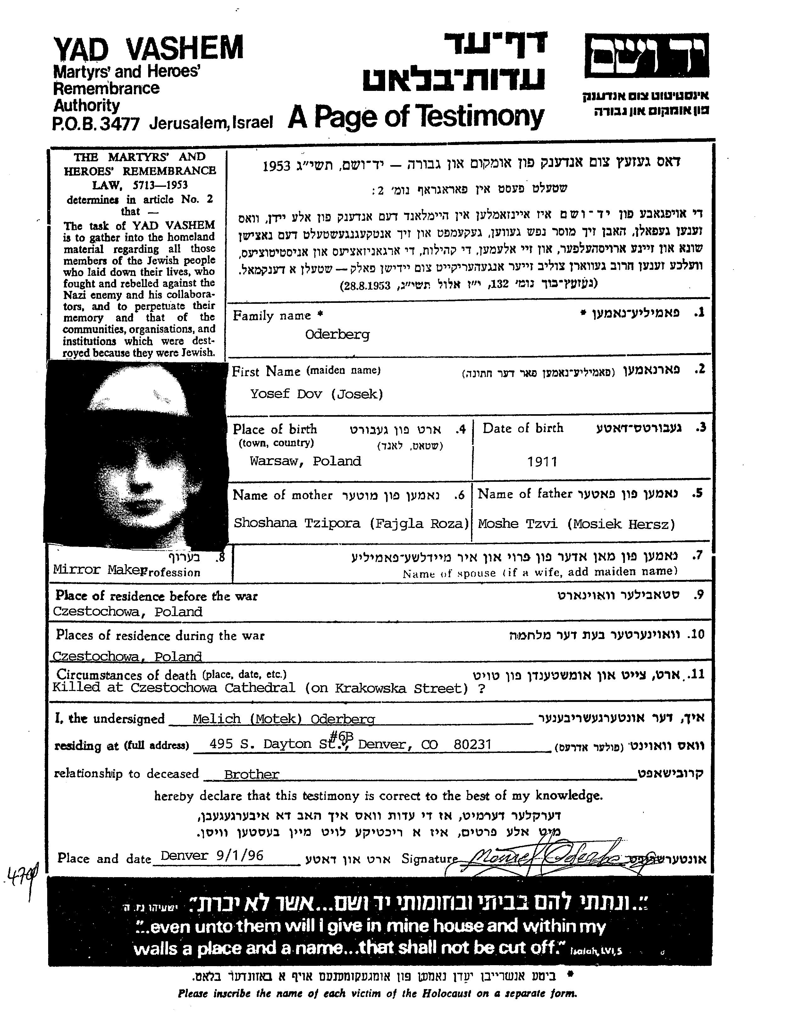 Dov Josek Oderberg wurde im Jahr 1911 in Warszawa, Polen geboren. Er war Mirror maker. Vor dem Zweiten Weltkrieg lebte er in Czestochowa, Polen.