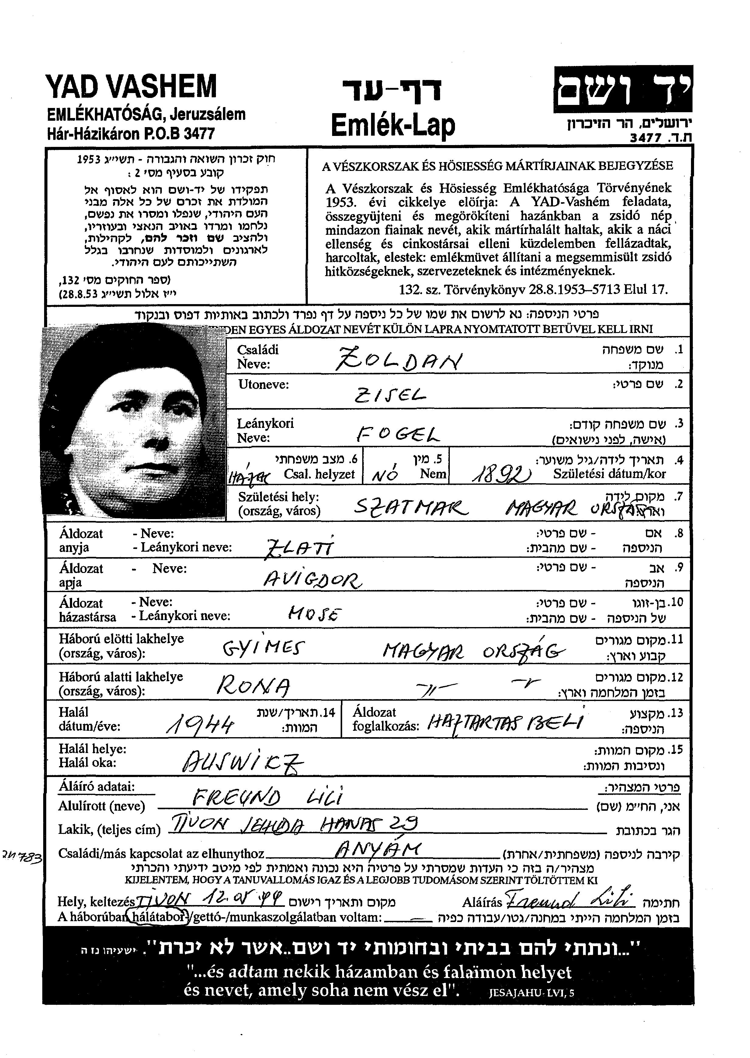 Zisel Zoldan, geb. Fogel wurde im Jahr 1892 in Satu Mare, Rumänien geboren. Sie war Hausfrau. Vor dem Zweiten Weltkrieg lebte sie in Gyimes.
